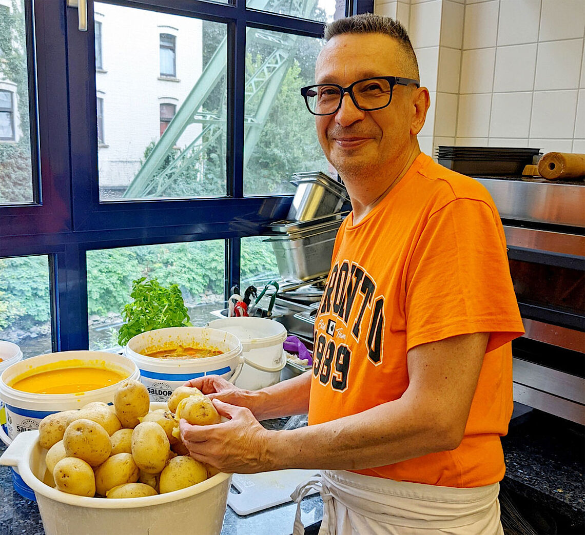Zu Hause sitzen liegt Michael Waltenberg nicht. Er ist gerne aktiv. Umso mehr freut es ihn, dass er eine Festanstellung als Koch bei der Färberei/Zentrum für Integration und Inklusion bekommen hat. Das ist das Ergebnis einer erfolgreichen Maßnahme Train2beplus im Auftrag des Jobcenters Wuppertal bei forum. In der Färberei kann er seine beiden Ausbildungen als Koch und als Konditor perfekt einsetzen: Denn neben täglich wechselnden Mittagsgerichten bietet das Café der Färberei auch immer frisch gebackene Kuchen an.