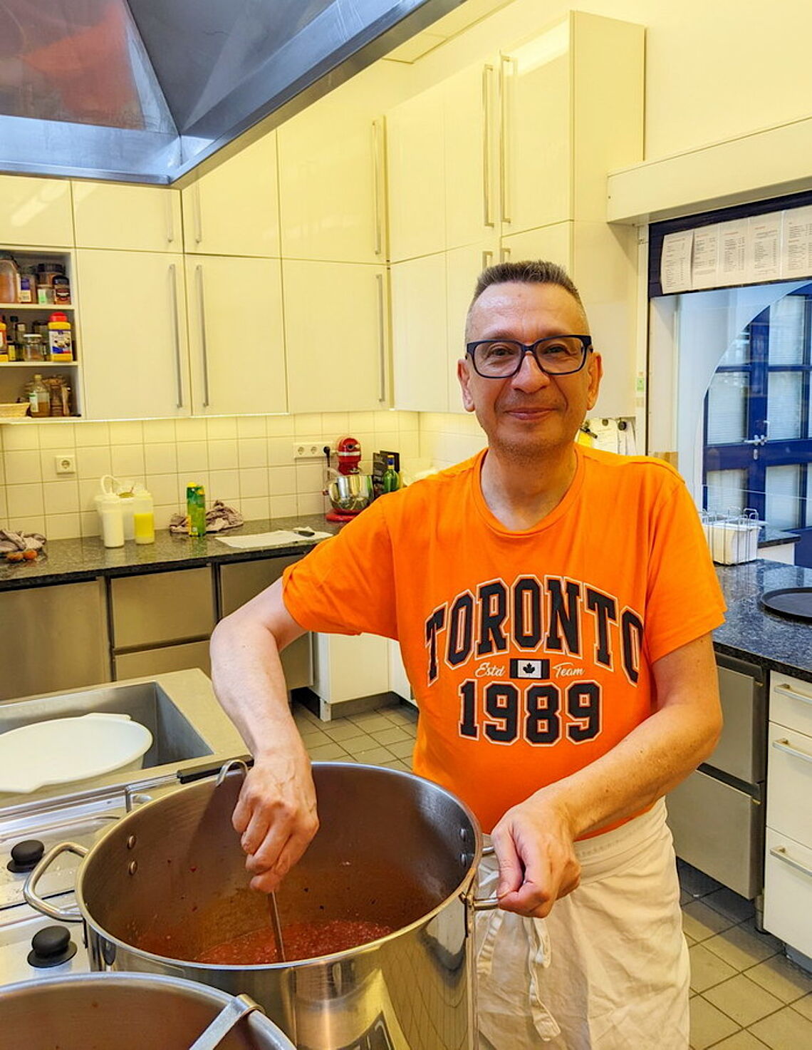 Wichtig ist Michael Waltenberg dabei, dass er in der Färberei nicht unter Druck gesetzt wird: „Wenn ich mal eine Pause brauche, kann ich mich auch mal herausziehen. Und der Umgangston ist ein ganz anderer als draußen“, lobt er seinen neuen Arbeitgeber. Früher hat er da andere Dinge erlebt: 220 bis 230 Stunden Arbeit pro Monat, arbeiten von 9 bis 15 Uhr und dann wieder von 18 Uhr bis spät in die Nacht, kein Wochenende frei, und dabei jede Menge Hektik und Aggression. Das führte irgendwann zum Burnout.Im Sozialpsychiatrischen Zentrum kochte er dann ehrenamtlich und stellte fest, dass er eigentlich schon gerne kocht. Nur eben in Ruhe. Das SPZ empfahl ihm, beim Jobcenter die Maßnahme Train2be bei forum/proviel zu beantragen. So kam er vor drei Jahren zu forum und wechselte später in die Maßnahme Train2beplus. „Die Anleiter waren sehr zuvorkommend“, freut er sich über die neue Erfahrung. Zwei Praktika machte er als Koch in Unternehmen, doch es passte nicht für ihn. Eigentlich hatte er die Hoffnung auf einen Arbeitsplatz ohne Überstunden auf dem ersten Arbeitsmarkt schon aufgegeben, als Geschäftsführer Christoph Nieder über das Paritätische Netzwerk und über facebook erfuhr, dass die Färberei einen Koch suchte. Und hier, wo Integration groß geschrieben wird, passte alles. Erst machte Michael Waltenberg ein Praktikum, ab Oktober hat er jetzt einen festen Arbeitsvertrag.
