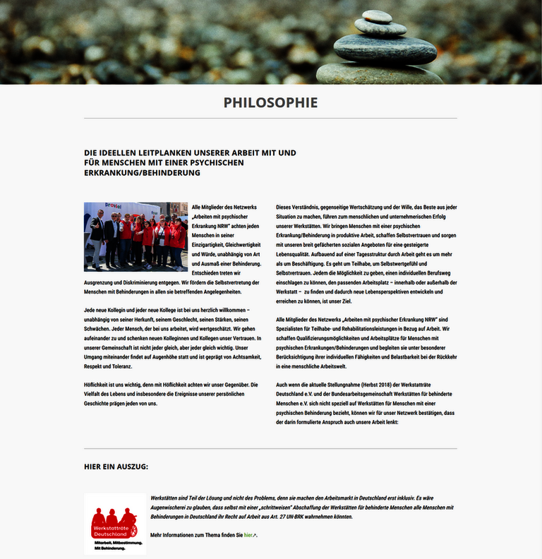 Auch wenn die Stellungnahme der Werkstatträte Deutschland e.V. und der Bundesarbeitsgemeinschaft Werkstätten für behinderte Menschen e.V. aus dem Herbst 2018 sich nicht speziell auf Werkstätten für Menschen mit einer psychischen Behinderung bezieht, können wir für unser Netzwerk bestätigen, dass der darin formulierte Anspruch auch unsere Arbeit lenkt:„Werkstätten sind Teil der Lösung und nicht des Problems, denn sie machen den Arbeitsmarkt in Deutschland erst inklusiv. Es wäre Augenwischerei zu glauben, dass selbst mit einer „schrittweisen“ Abschaffung der Werkstätten für behinderte Menschen alle Menschen mit Behinderungen in Deutschland ihr Recht auf Arbeit aus Art. 27 UN-BRK wahrnehmen könnten.“