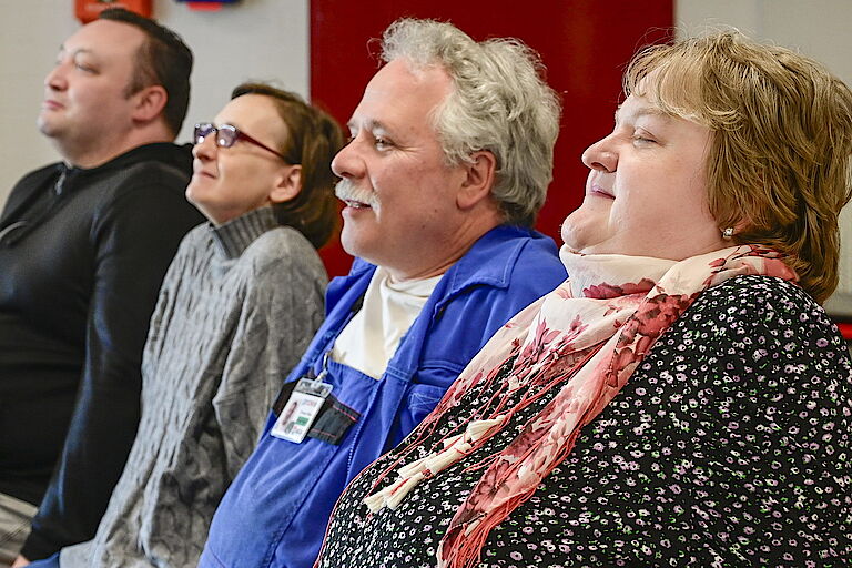 BB-Kurs stärkt KörperwahrnehmungNach jeder Anspannung fragt er, wie sich der Körperteil anfühlt. Manche spüren Wärme darin, bei manchen ist er schwer oder besonders leicht, oder er kribbelt. Am Schluss folgt noch eine Reflexions-Runde. Kamen auch die Gedanken zur Ruhe oder heute nicht? „Mein Kopf ist so voll“, entschuldigt sich jemand. Das sei völlig in Ordnung, beruhigt der Anleiter. Einer hat sein Herz stolpern gespürt, eine merkte, dass der Pulsschlag langsamer wird. Eines jedoch zeigt sich bei allen: Der laute Alltag rückt weiter weg, die Aufmerksamkeit richtet sich nach innen.