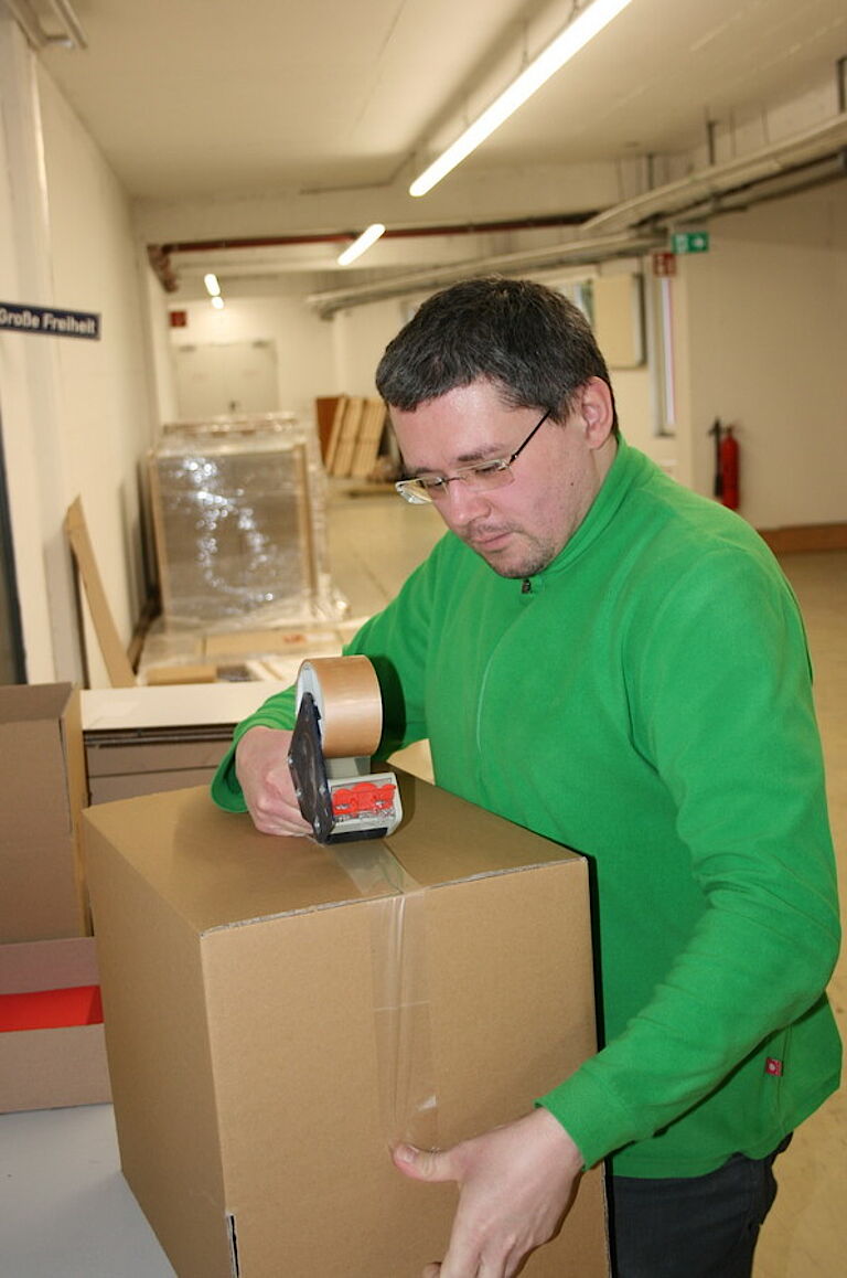 Als sein Arbeitsanleiter ihm vorschlug, in die Aufbaumaßnahme Train2beplus zu wechseln, lehnte er erst einmal erschrocken ab. Die Arbeit unter realen Bedingungen – wenn auch im schützenden Rahmen von forum/proviel – bereitete ihm Sorgen. „Ich habe mir vorgestellt, dass die Arbeitsweise eine ganz andere wäre, dass mich die Chefs jeden Tag anschreien würden“, erzählt er. Ein halbes Jahr später hatte ihm jedoch die Ergotherapie so viel Selbstvertrauen gegeben, dass er den Schritt wagte und feststellte: „Es ist niemals so schlimm, wie man es sich vorstellt.“ Schrittweise erhöhte er seine Arbeitszeit von 5,5 Stunden am Tag auf Vollzeit. Die Anleiter von Train2beplus achteten auf das Einhalten der Pausenlängen und kontrollierten die Produktivität ihrer Schützlinge, um diese konkurrenzfähig für den ersten Arbeitsmarkt zu machen. Nach drei Monaten wechselte Christoph Kosmalski zum Standort Farbmühle. So lernte er, sich in ein komplett neues Team einzufinden. Für sich persönlich betrachtete Kosmalski die Zeit als Test: „Kann ich den Druck, der durch Arbeitsspitzen im Betriebsablauf entsteht, aushalten?“ Er entschied: Ja. Stück für Stück übernahm er immer anspruchsvollere Aufgaben und erneuerte auch seinen Gabelstaplerschein.