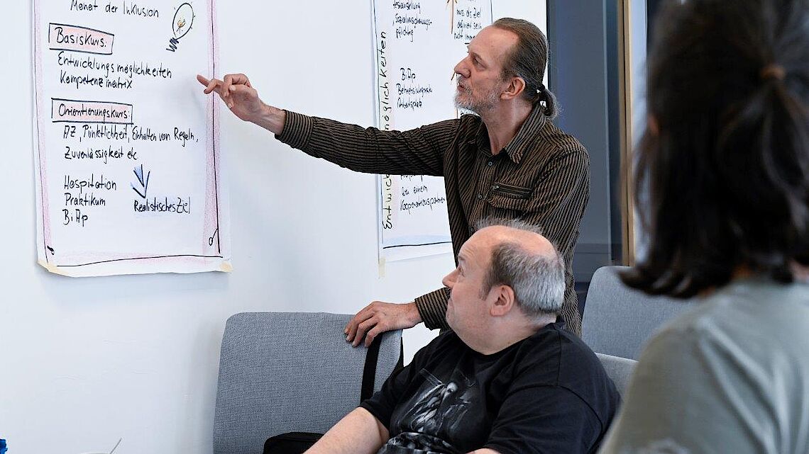 Was für Arbeitsmöglichkeiten bietet mir proviel? Und wie passen meine persönlichen Stärken und Schwächen zu den Anforderungen verschiedener Arbeitsplätze? Darum geht es im „Monat der Inklusion“ (MDI) im Rahmen der Beruflichen Reha von proviel.Kursleiterin Britta Düllmann veranschaulicht das Thema mit großen Schaubildern. Denn so viele Dinge spielen mit hinein, ob jemand sich wohl fühlt an einem Arbeitsplatz. Das zeigt sie am Eisberg-Modell: „Manches ist sichtbar – Worte, Körpersprache, Handlungen. Aber vieles andere ist nicht sichtbar: Sorgen, Gefühle, Bedürfnisse, persönliche Probleme, Krankheiten, Fähigkeiten“, erklärt sie. Und sie rät: „Im besten Fall interpretiert man nicht, sondern man fragt nach.“ Dabei sei jedoch wichtig, zu bedenken, dass gesagt noch nicht gehört ist und dass gehört noch nicht verstanden ist. Im Zweifel helfe eine weitere Nachfrage, empfiehlt sie.