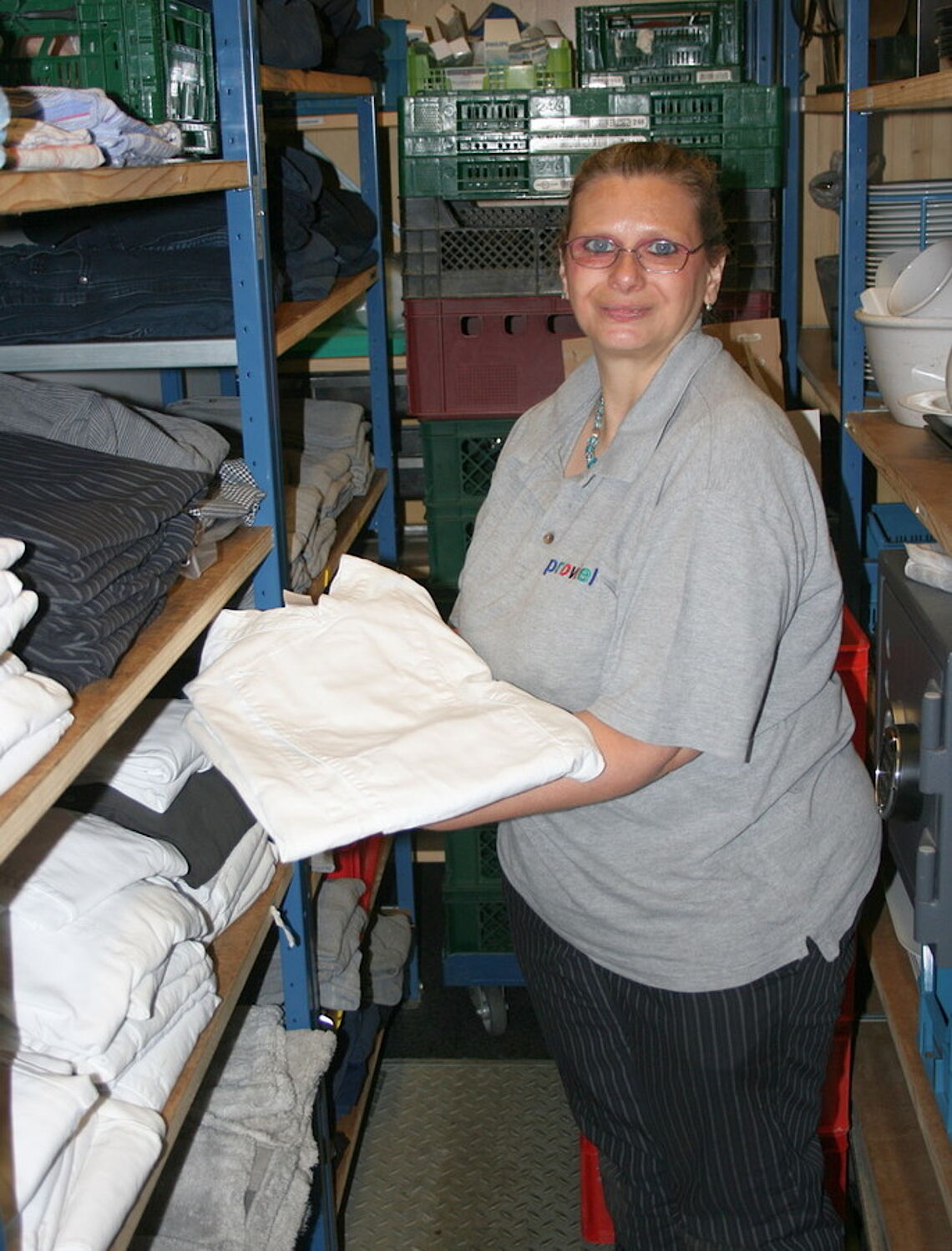 Durch ihre Arbeit im Okavango hat sie nicht nur den Umgang mit den Kollegen, sondern auch mit Gästen gelernt. Manche fragen nach dem Weg zum Ausgang, dann versucht die 51-Jährige, ihnen einen passenden aus den verschiedenen Möglichkeiten zu beschreiben. Im Okavango sorgt sie für Ordnung in den Umkleideräumen und im Lager, achtet darauf, dass zwischen gebügelter Arbeitskleidung, Dosen und Geschirr kein Chaos entsteht. Alle vier Wochen zählt sie bei der nötigen Inventur die Vorräte. Hier hilft ihr ihre Ausbildung im Einzelhandel.