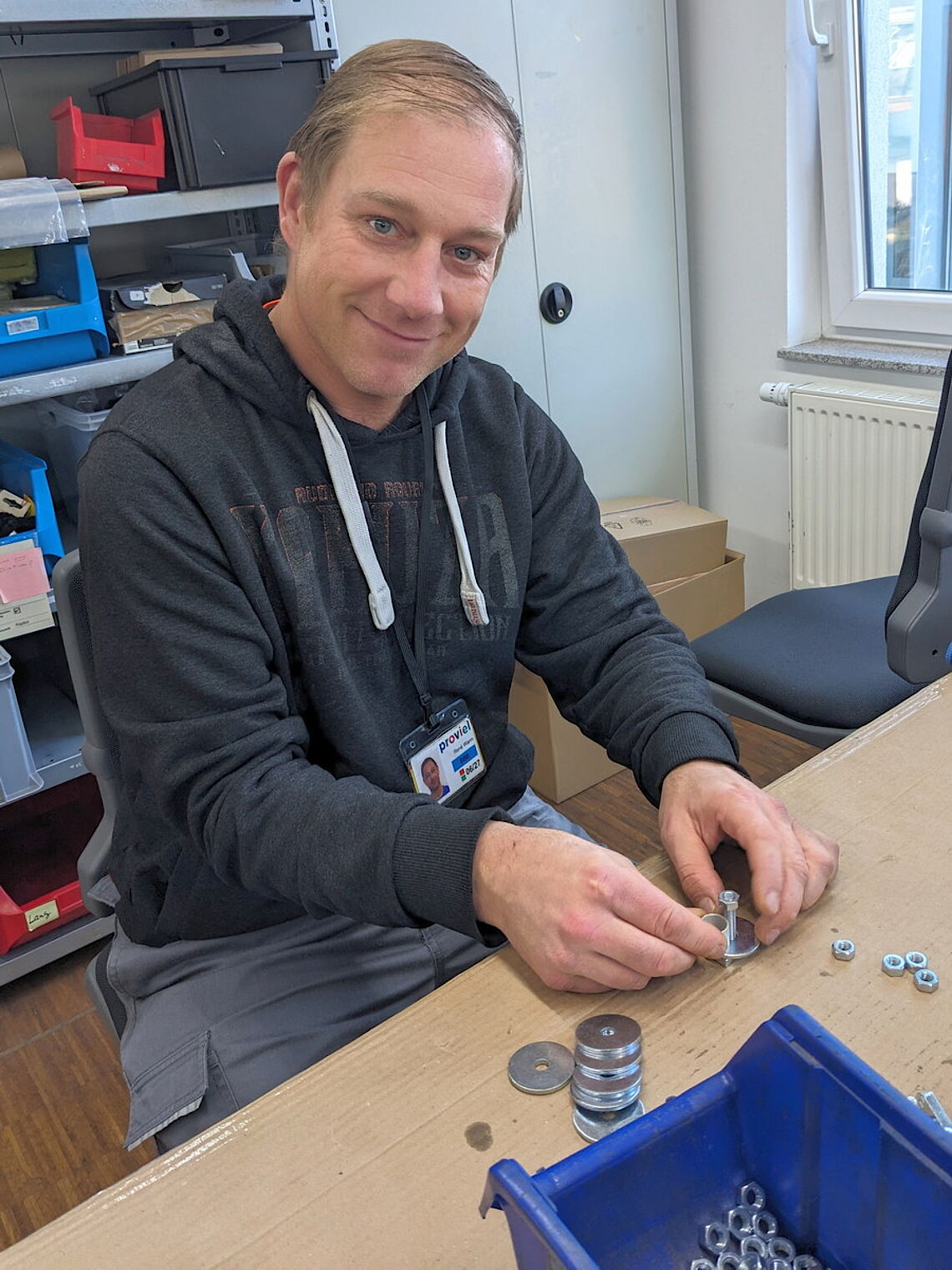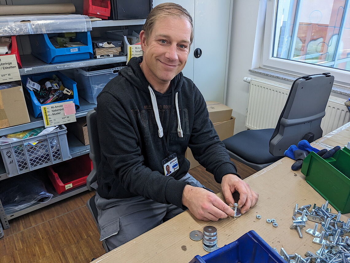 Dort sieht er gute Chancen für sich: „Hier kann ich an meiner Konzentration und an meiner Ausdauer während der Arbeit feilen.“ So erinnert sich René Warm an die Arbeit am Lötkolben, die ihm schwer fiel. Am liebsten hätte er alles sofort hingeworfen. Die Fachkräfte motivierten ihn jedoch, dranzubleiben. „Das dauerte eineinhalb Tage, und es stand mir am ersten Tag ein bisschen im Hals – aber dann habe ich mich überwunden und es hat geklappt“, freut er sich im Rückblick. Dieses Erfolgserlebnis zeigte dem 44-Jährigen, dass es sich lohnt, neue Dinge auszuprobieren und sich dafür etwas Zeit zu geben. Überhaupt schätzt René Warm die Möglichkeit, bei proviel Dinge auszuwählen – angefangen vom Essen bis zur Art der Arbeit. „Es ist klasse, wenn man das Gefühl hat, man kann selbst gestalten.“