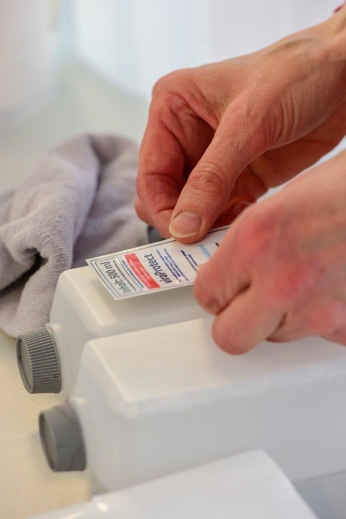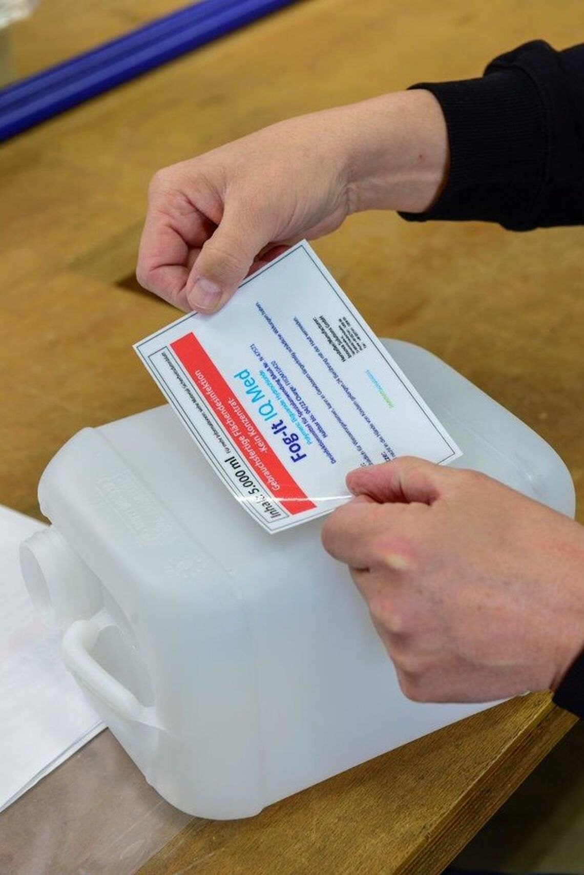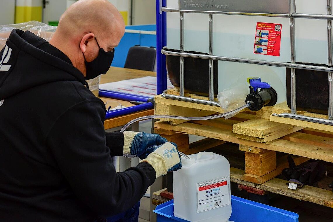 Am Standort Milchstraße werden jetzt 500-Milliliter-Flaschen etikettiert und befüllt, am Standort Farbmühle Fünf-Liter-Kanister. Da die Werkstätten zu Beginn der Krise durch Betretungsverbote für die Menschen mit Behinderung fast ohne Mitarbeiter waren, haben anfangs die Fachkräfte und einzelne Werkstattmitarbeiter in Notbetreuung das Abfüllen übernommen. Inzwischen gibt es durch erweiterte Notgruppen und die schrittweise Öffnung wieder mehr Hände, die alle gerne das alkoholfreie Desinfektionsmittel umfließen lassen und so den vielen Wuppertaler Einrichtungen die richtigen Portionsgrößen verschaffen.