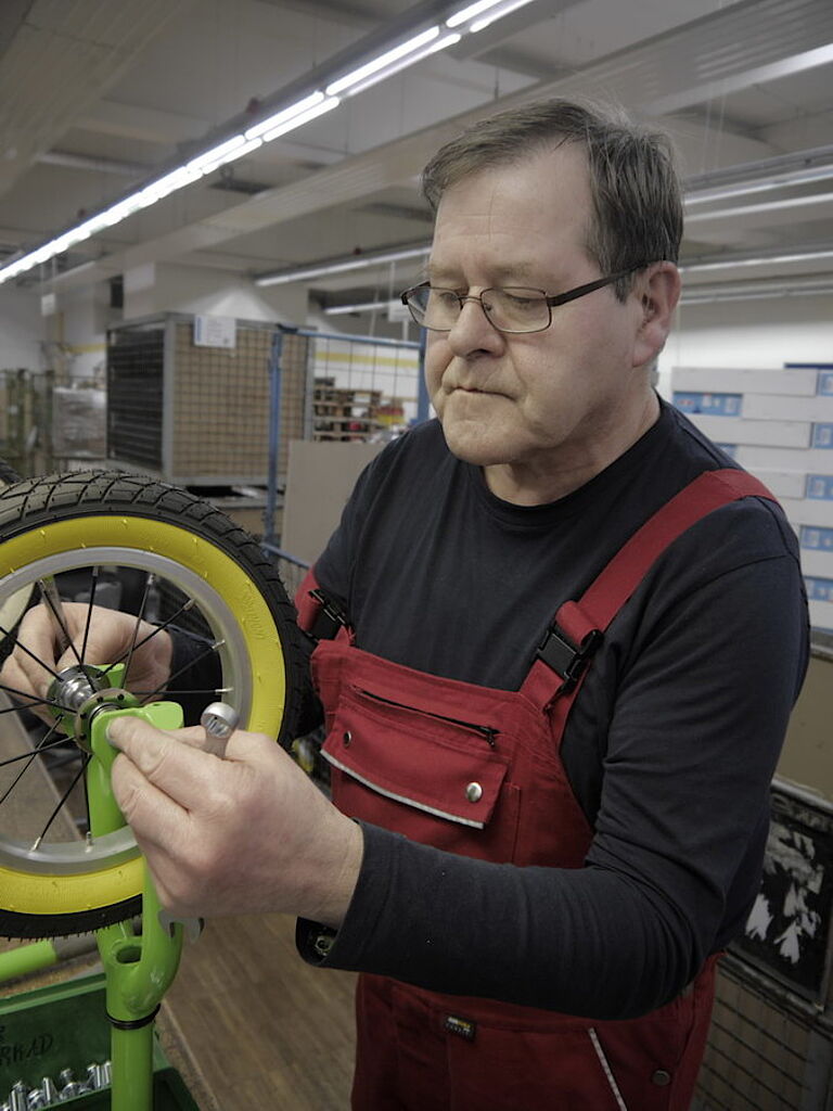 Dass er im Herbst in den Ruhestand geht, beunruhigt ihn ein bisschen. „Da muss ich mir dann eine Beschäftigung suchen“, meint er. Denn schon an den Wochenenden ohne Arbeit langweilt er sich etwas. Am liebsten würde er weiter bei proviel bleiben. „Ich bin froh, dass ich hier bin. Die Roller zusammenzubauen macht mir Spaß.“ Pünktlich steht er jeden morgen um 6 Uhr an seinem Arbeitsplatz. Zwischendurch hat er auch andere Abteilungen ausprobiert oder montiert manchmal Schlösser – doch die Rollermontage gefällt ihm eindeutig am besten. „Einmal habe ich sogar in Holland unsere Laufräder gesehen“, berichtet er stolz.