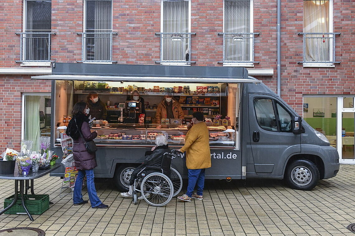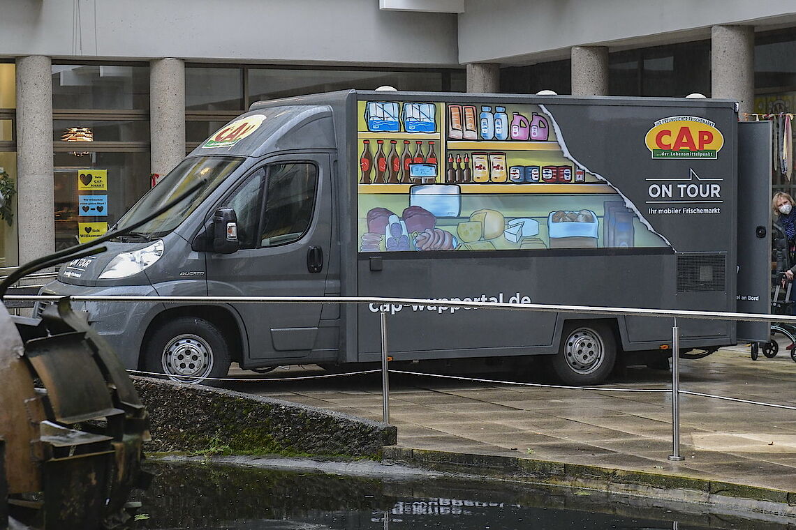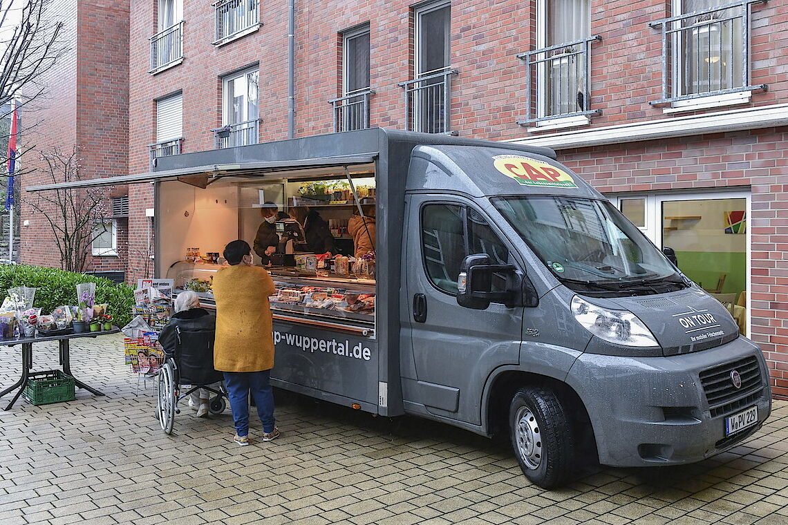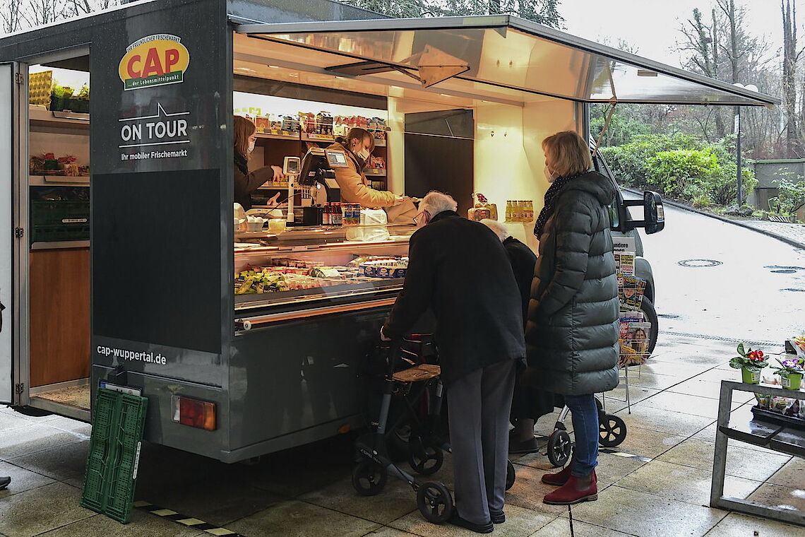 Ein Päckchen Brot, Marmelade, drei Clementinen und eine Tafel Schokolade – glücklich nimmt die Kundin den Beutel in Empfang, den ihr die CAP-Mitarbeiterin reicht. „So brauche ich nicht in die Stadt, das wäre mir zu umständlich“, sagt Lore Knapp. proviel und der CAP-Frischemarkt haben gemeinsam einen Verkaufswagen eingerichtet, der zukünftig dienstags und donnerstags erste Seniorenheime in Elberfeld und Vohwinkel anfährt. So können die Bewohner ohne große Wege direkt vor ihrem Haus alle Dinge des täglichen Bedarfs einkaufen. Ist einmal ein gewünschtes Produkt nicht vorrätig, können sie es für den nächsten Besuch bestellen.