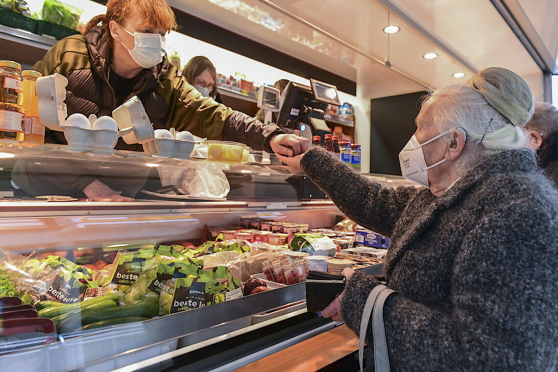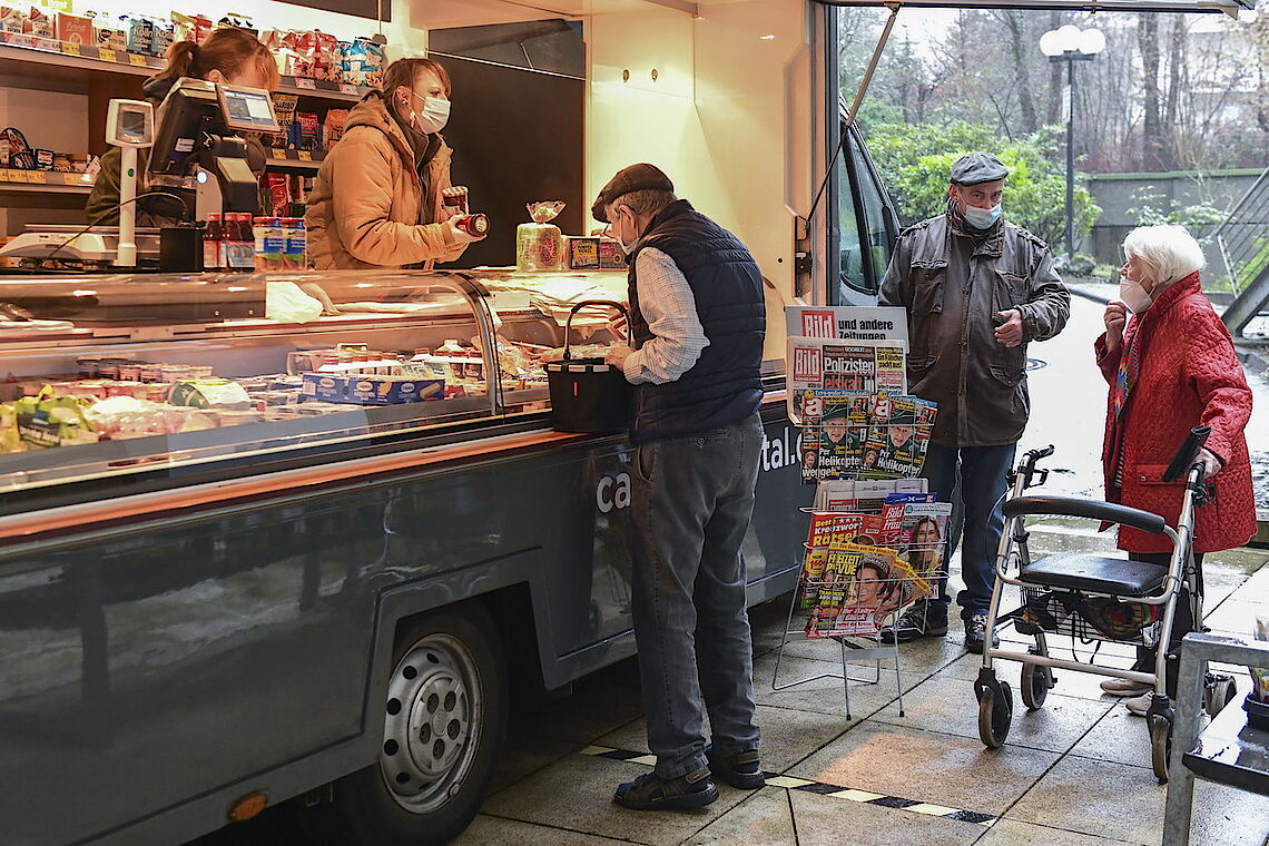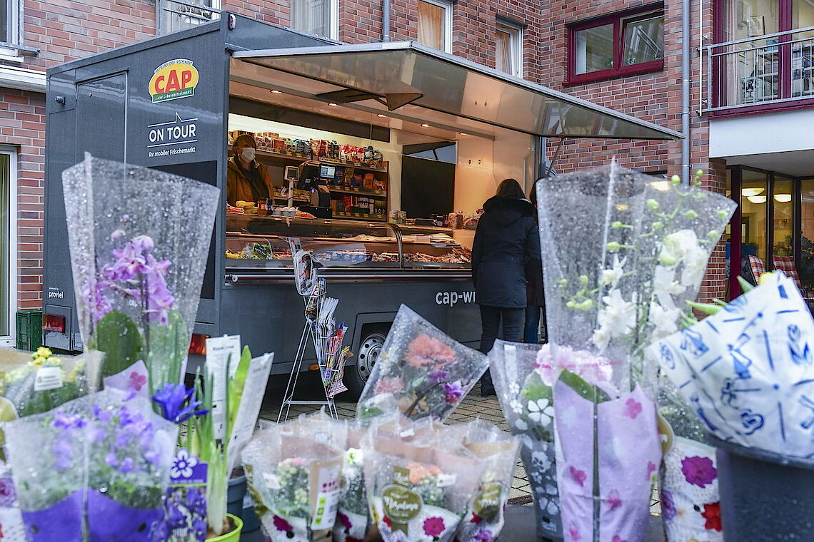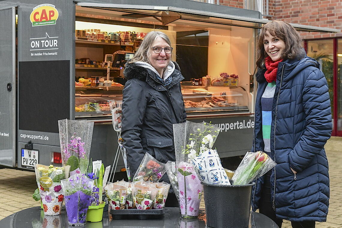 Ein Päckchen Brot, Marmelade, drei Clementinen und eine Tafel Schokolade – glücklich nimmt die Kundin den Beutel in Empfang, den ihr die CAP-Mitarbeiterin reicht. „So brauche ich nicht in die Stadt, das wäre mir zu umständlich“, sagt Lore Knapp. proviel und der CAP-Frischemarkt haben gemeinsam einen Verkaufswagen eingerichtet, der zukünftig dienstags und donnerstags erste Seniorenheime in Elberfeld und Vohwinkel anfährt. So können die Bewohner ohne große Wege direkt vor ihrem Haus alle Dinge des täglichen Bedarfs einkaufen. Ist einmal ein gewünschtes Produkt nicht vorrätig, können sie es für den nächsten Besuch bestellen.