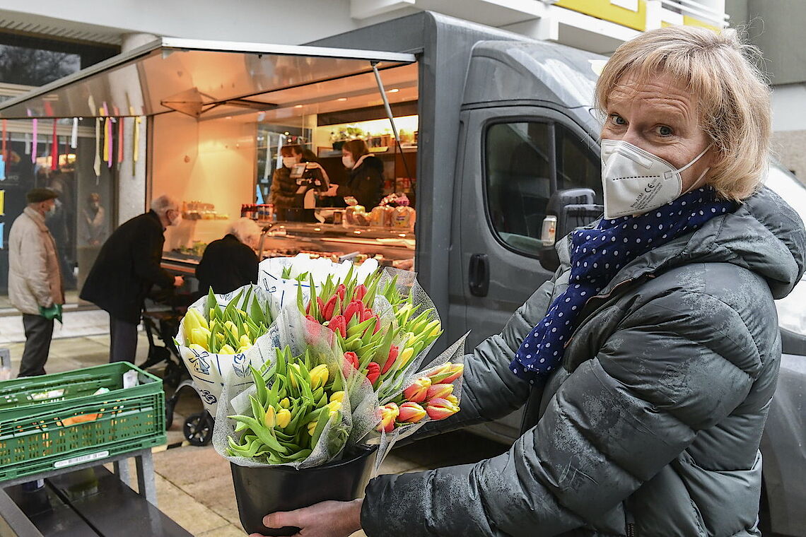 Kaum hatte der Verkaufswagen um 9 Uhr die Klappe geöffnet, standen die Kundinnen Schlange. In den Appartements bereiten viele ihr Frühstück und Abendessen selbst zu und benötigen dafür die Zutaten. Auch die Tulpen und Primeln fanden schnellen Absatz. „Das Angebot ist wirklich sehr vielversprechend“, lobte Kundin Brigitte Müller.
