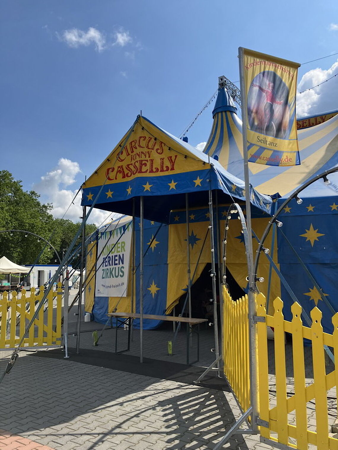 Der Zirkus Jonny Casselly ist in der Stadt und lässt den Carnaper Platz erneut für drei Wochen der Sommerferien bunt aufblühen. Das jährliche Ferienangebot lädt zu Action, Akrobatik und Spielspaß ein! Kein Wunder, dass bei so viel Aktivität der circa 150 Sechs- bis Vierzehnjährigen auch ab und an der Hunger aufkommt. Unser Team aus dem Schulbistro des Gymnasiums Sedanstraße teilt für die teilnehmenden Kinder das am Standort Farbmühle zubereitete Mittagessen aus und knüpft so an die bewährte Tradition und Erfahrungen an.