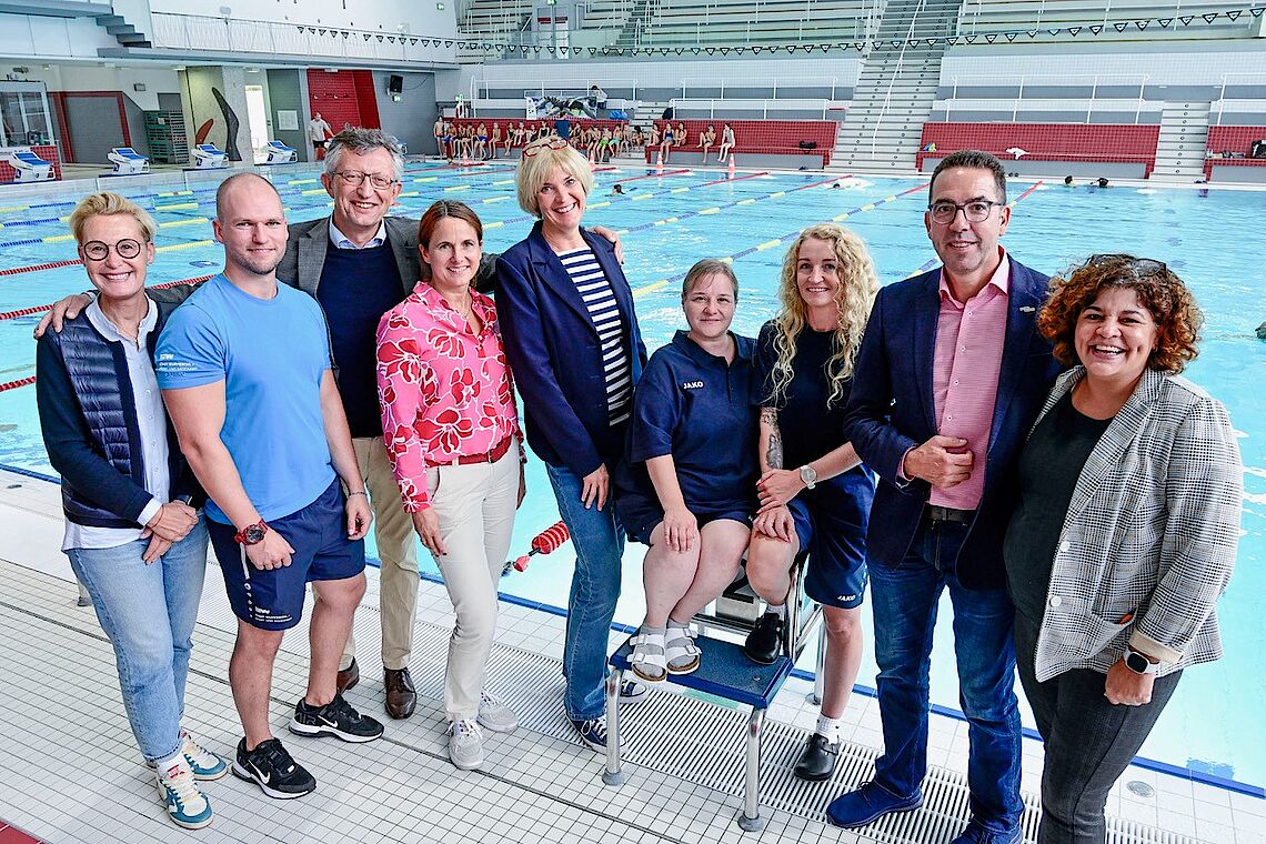 Damit bildeten sich die provieler weiter in einem Berufsbild, in dem viele Fachkräfte fehlen. Zusammen mit den städtischen Bäderbeschäftigten absolvierten sie den Erste-Hilfe-Kurs beim Sport- und Bäderamt, lernten die Haus- und Badeordnung der städtischen Bäder kennen und trainierten teilweise noch nach Feierabend für den Rettungsschwimmer. „Zwei Teilnehmerinnen haben bereits das Rettungsschwimmabzeichen in Bronze geschafft“, freuen sich Ulrike Hoffmeister und Thomas Koch (Fachkräfte im Gartenhallenbad Langerfeld), die das Schwimmtraining begleitet haben. Beide streben nun das Abzeichen in Silber an. Das Rettungsschwimmabzeichen Silber ist die Voraussetzung für viele Schwimmbad-Jobs. „Die Teilnehmenden sind total motiviert – das ist schön zu sehen“, freut sich Yesim Fischer, Leiterin der Inklusion bei proviel. „Mit den Bädern können wir noch einmal ein ganz anderes Berufsfeld anbieten, in dem es viele Jobs gibt.“