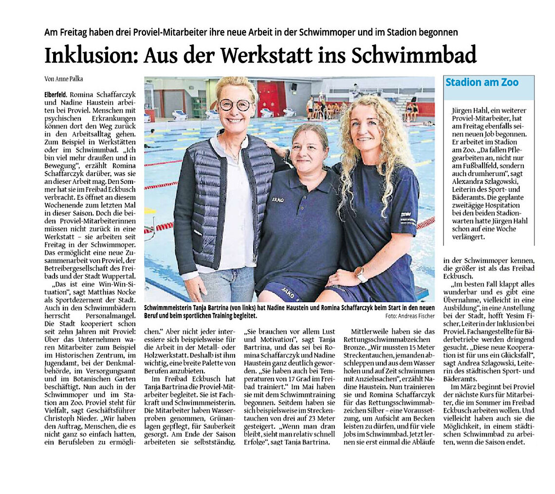 provieler arbeiten in verschiedenen städtischen AbteilungenMit dem Freibad-Team nimmt die Kooperation mit der Stadt Wuppertal Fahrt auf, die bereits seit 2013 läuft. Seitdem gab und gibt es 16 BiAps bei der Stadt in ganz unterschiedlichen Abteilungen: provieler arbeiten im Historischen Zentrum, im Jugendamt, bei der Denkmalbehörde, im Versorgungsamt und im Botanischen Garten. Eine Person davon wechselte inzwischen auf einen sozialversicherungspflichtigen Arbeitsplatz bei der Stadt Wuppertal. „Diese Kooperation ist wertvoll für uns, weil damit Menschen mit psychischen Erkrankungen in ganz unterschiedlichen Bereichen mitten in der Gesellschaft arbeiten können“, betont proviel-Geschäftsführer Christoph Nieder. „Damit werden Barrieren abgebaut.“ Michael Telian, Leiter des Personalamtes, bekräftigt: „Damit leistet die Stadt Wuppertal einen wertvollen Beitrag zur Inklusion.“