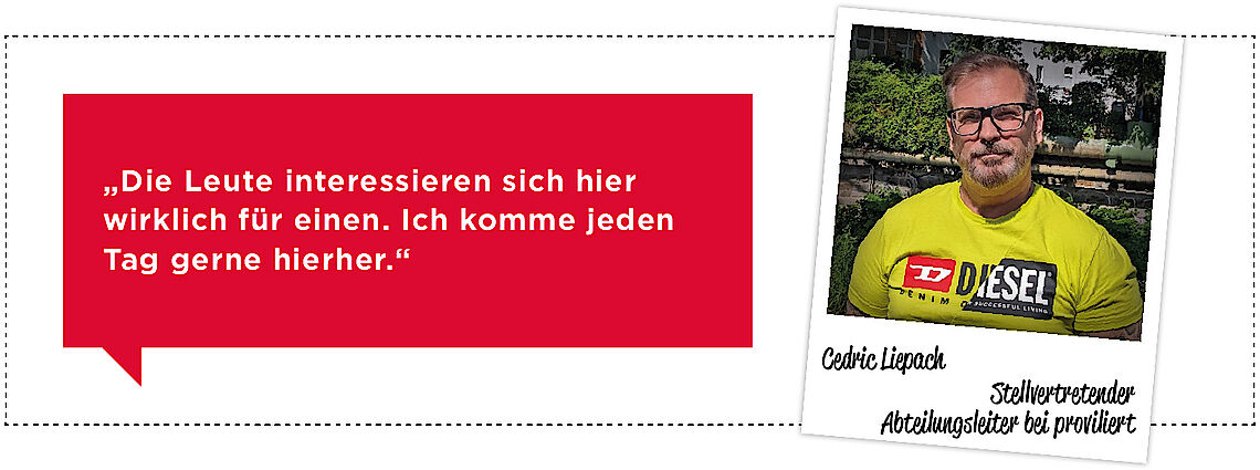 Als dann ein stellvertretender Abteilungsleiter bei proviliert gesucht wurde, bewarb sich Cedric Liepach. So kann er seine Führungserfahrung aus seinem früheren Berufsleben einbringen. Bei proviliert – oft die erste Abteilung für Neuprovieler – erklärt er geduldig die Aufgaben, ermutigt zu komplizierteren Tätigkeiten, verteilt Arbeitsbereiche. Schließlich gibt es von einfach bis komplex in der Abteilung viele Möglichkeiten: mit und ohne Maschine, ein Arbeitsschritt oder viele, große Teile oder winzig kleine. Der Spagat zwischen Fördern und Fordern und dem rechtzeitigen Erledigen der Aufträge fasziniert Cedric Liepach. „Bis jetzt war meine Zeit hier super spannend. Ich lerne trotz der guten Einarbeitung immer wieder etwas Neues kennen.“ Voller Lob ist er auch für das Miteinander: „Die Leute interessieren sich hier wirklich für einen. Ich komme jeden Tag gerne hierher.“