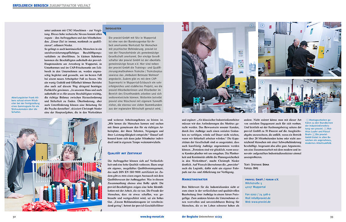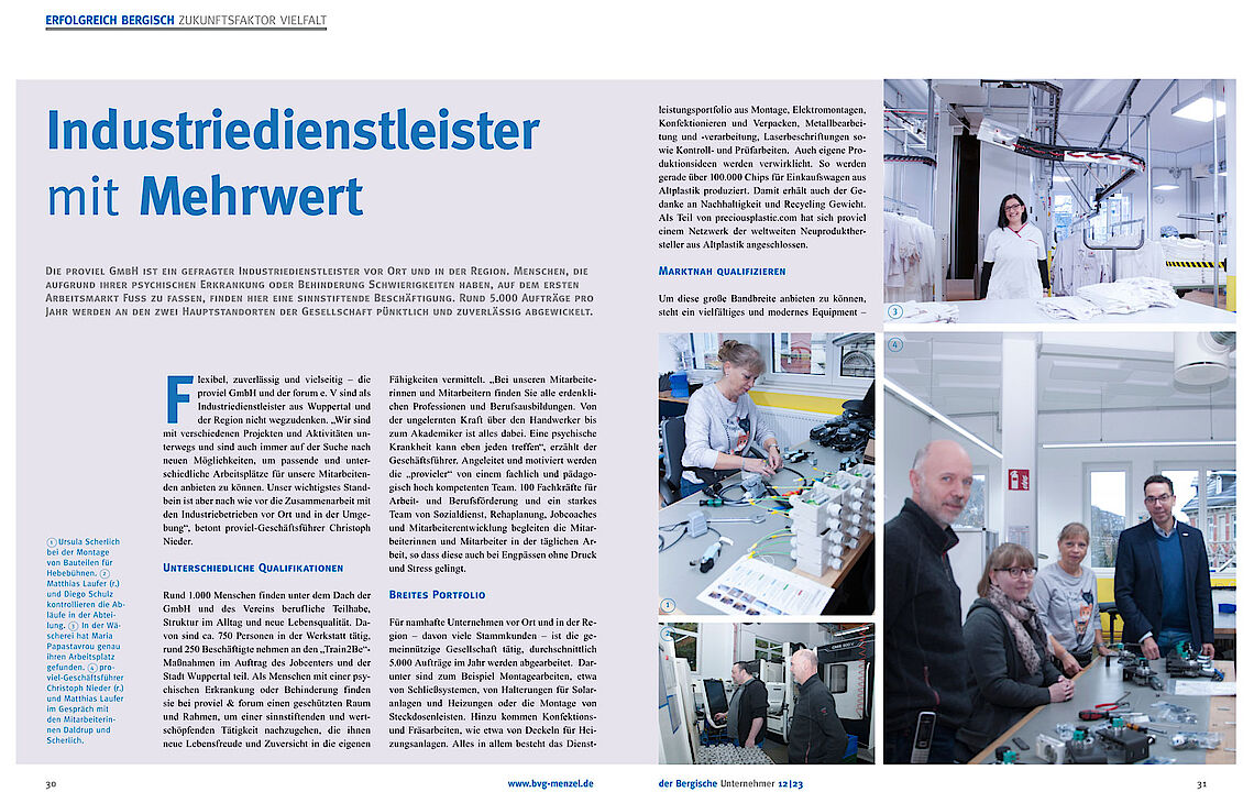 Rund 1.000 Menschen finden unter dem Dach der GmbH und des Vereins berufliche Teilhabe, Struktur im Alltag und neue Lebensqualität. Davon sind ca. 750 Personen in der Werkstatt tätig, rund 250 Beschäftigte nehmen an den „Train2Be“-Maßnahmen im Auftrag des Jobcenters und der Stadt Wuppertal teil. Als Menschen mit einer psychischen Erkrankung oder Behinderung finden sie bei proviel & forum einen geschützten Raum und Rahmen, um einer sinnstiftenden und wertschöpfenden Tätigkeit nachzugehen, die ihnen neue Lebensfreude und Zuversicht in die eigenen Fähigkeiten vermittelt. „Bei unseren Mitarbeiterinnen und Mitarbeitern finden Sie alle erdenklichen Professionen und Berufsausbildungen. Von der ungelernten Kraft über den Handwerker bis zum Akademiker ist alles dabei. Eine psychische Krankheit kann eben jeden treffen“, erzählt der Geschäftsführer. Angeleitet und motiviert werden die „provieler“ von einem fachlich und pädagogisch hoch kompetenten Team. 120 Fachkräfte für Arbeit- und Berufsförderung und ein starkes Team von Sozialdienst, Rehaplanung, Jobcoaches und Mitarbeiterentwicklung begleiten die Mitarbeiterinnen und Mitarbeiter in der täglichen Arbeit, so dass diese auch bei Engpässen ohne Druck und Stress gelingt.