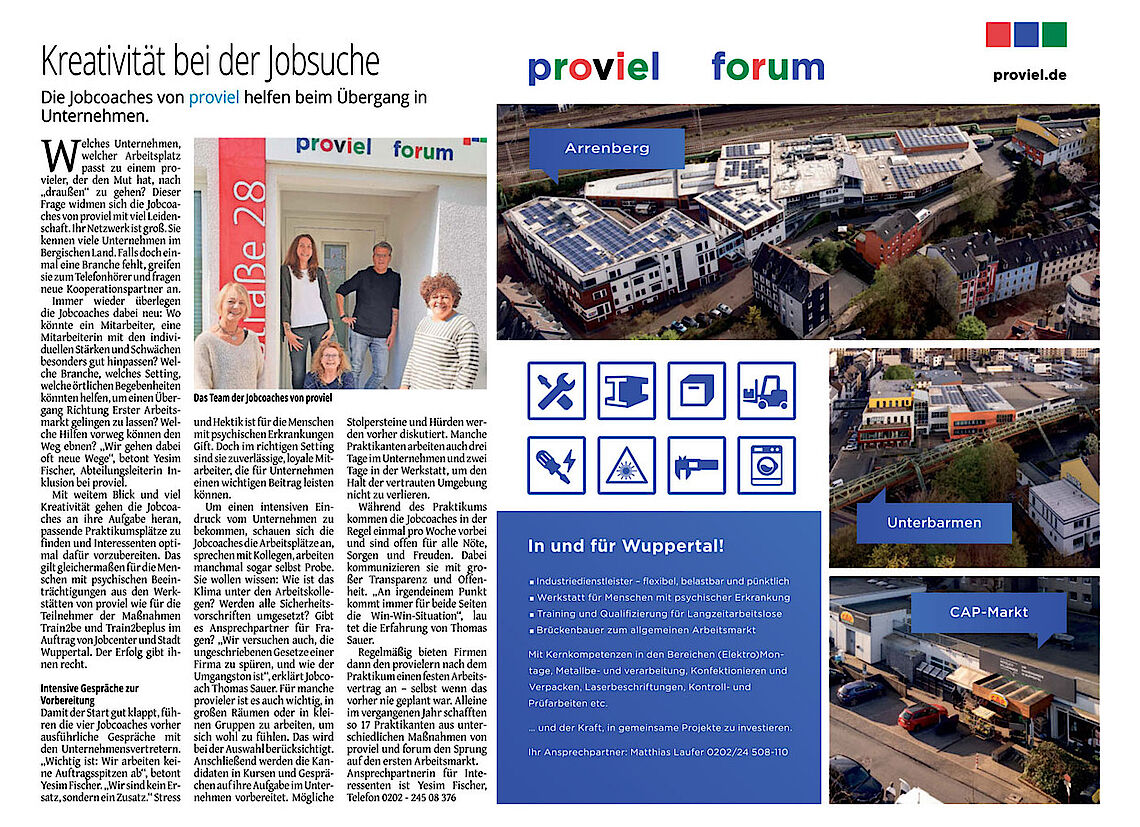 Mit weitem Blick und viel Kreativität gehen die Jobcoaches an ihre Aufgabe heran, passende Praktikumsplätze zu finden und Interessenten optimal dafür vorzubereiten. Das gilt gleichermaßen für die Menschen mit psychischen Beeinträchtigungen aus den Werkstätten von proviel wie für die Teilnehmerinnen und Teilnehmer der Maßnahmen Train2be und Train2beplus im Auftrag von Jobcenter und Stadt Wuppertal. Der Erfolg gibt ihnen Recht.