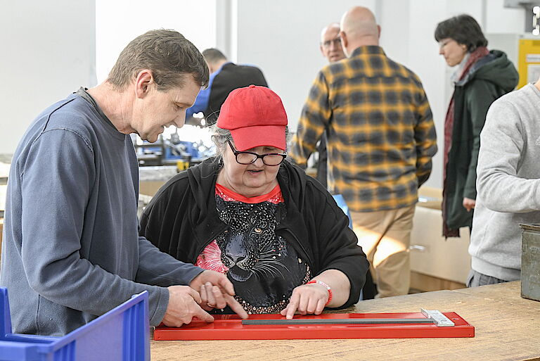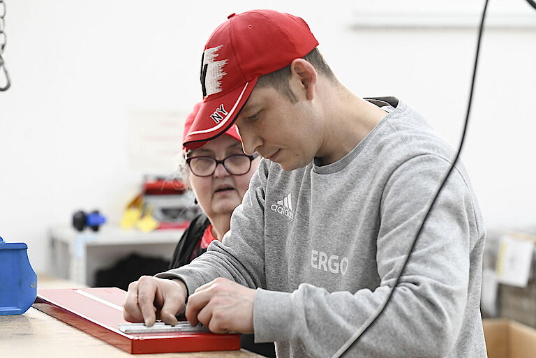 Die Arbeitsplätze zur laufenden Qualifizierung der Teilnehmer*innen für die Montage der HOLTMANN-Produkte befinden sich im Bereich der Beruflichen Bildung. Dort geht es darum, psychisch erkrankte Menschen im Rahmen einer beruflichen Reha wieder an Arbeit und einen strukturierten Tagesablauf heranzuführen. „An diesen Arbeitsplätzen kann Teamarbeit gut trainiert werden: Hier können die Teilnehmer*innen auch lernen, zu akzeptieren, dass andere in einer anderen Geschwindigkeit arbeiten“, erklärt Anja Kranenberg, Abteilungsleiterin der Beruflichen Bildung. Gleichzeitig üben die Teilnehmer*innen unter anderem Pünktlichkeit, Abmeldung im Krankheitsfall und wertschätzenden Umgang miteinander.
