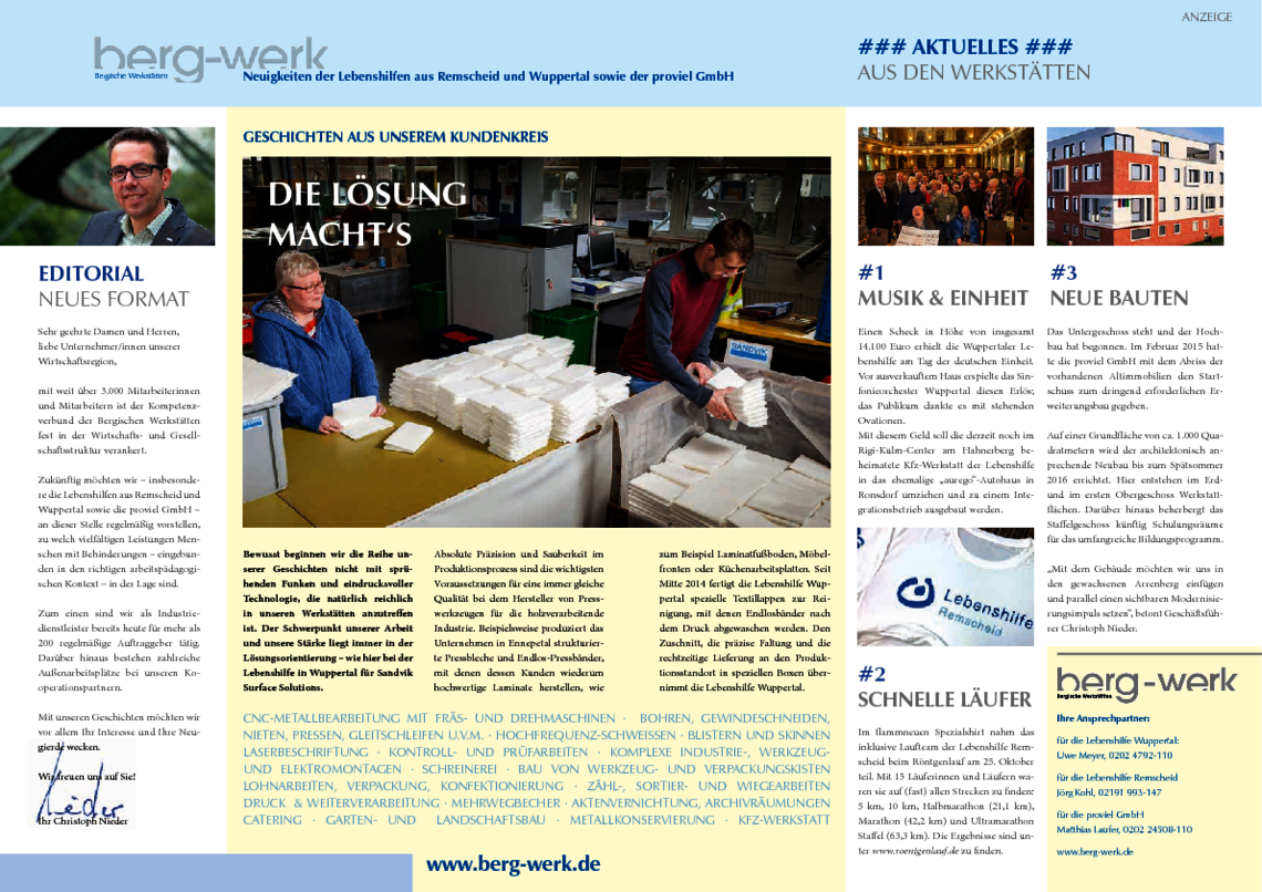 Im Trio mit den Lebenshilfen in Wuppertal und Remscheid haben wir uns jetzt dazu entschieden, über die Bergische Wirtschaft / Magazin der IHK Wuppertal-Solingen-Remscheid alle 2 Monate per Doppelseite die Leserinnen und Leser zu informieren.