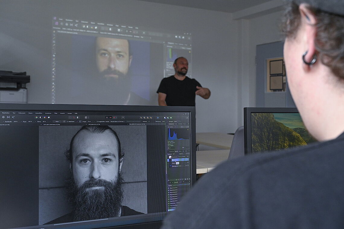Hier eine kleine Hautunreinheit beseitigen, dort den Schatten eines Fältchens aufhellen. Und schon sieht das Porträt noch attraktiver aus und gleichzeitig völlig natürlich. „Man sieht es so einem Bild nicht an, wie viel vorher passiert ist“, sagt Matthias Kiefer. Er fotografiert seit vielen Jahren und schätzt die vielfältigen Möglichkeiten der digitalen Bildbearbeitung. Diese gibt die Fachkraft aus der Beruflichen Bildung in Workshops auch an die provieler weiter. Jeweils vier Menschen können dann gleichzeitig die Computer nutzen – konzentriert ein oder zwei Tage lang über mehrere Stunden hinweg. Denn so können sie „in den Flow“ kommen und am Ende ihr Wunschporträt präsentieren.„Ich habe zu Hause schon mit einem Bildbearbeitungsprogramm gearbeitet und mir das Wissen mühsam mit Youtube-Videos angeeignet. So ein Kurs ist eine viel angenehmere Art, das zu lernen – hier kann ich einfach sofort nachfragen“, sagt Dennis Döll. Er schätzt das große Kursangebot bei proviel und möchte möglichst viel davon ausprobieren.Sein Porträtfoto hat er zuerst einmal von Farbe in Schwarz-Weiß umgewandelt und dann mit viel Ausdauer kleine Flecken auf der Haut per Reparaturstempel entfernt. „Das kann total entspannend sein, wenn man ein oder zwei Stunden an so etwas arbeitet“, lautet die Erfahrung von Matthias Kiefer.