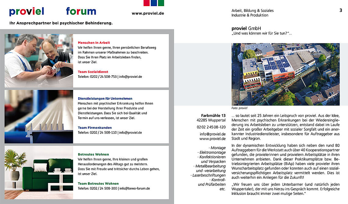 „Und was können wir für Sie tun?“... so lautet seit 25 Jahren ein Leitspruch von proviel. Aus der Idee, Menschen mit psychischen Erkrankungen bei der Wiedereingliederung ins Arbeitsleben zu unterstützen, entstand dabei im Laufe der Zeit ein großer Arbeitgeber mit sozialer Sorgfalt und ein anerkannter Industriedienstleister, insbesondere für Auftraggeber aus Stadt und Region.