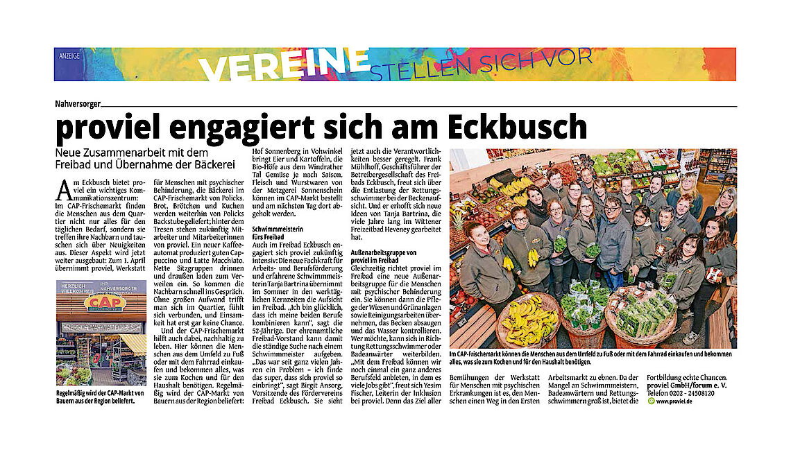 Am Eckbusch bietet proviel ein wichtiges Kommunikationszentrum: Im CAP-Frischemarkt finden die Menschen aus dem Quartier nicht nur alles für den täglichen Bedarf, sondern sie treffen ihre Nachbarn, tauschen sich über Neuigkeiten aus. Dieser Aspekt wird jetzt weiter ausgebaut: Zum 1. April übernimmt proviel, Werkstatt für Menschen mit psychischer Behinderung, die Bäckerei im CAP-Frischemarkt von Policks. Brot, Brötchen und Kuchen werden weiterhin von Policks Backstube geliefert; hinter dem Tresen stehen zukünftig Mitarbeiter*innen von proviel. Ein neuer Kaffeeautomat produziert guten Cappuccino und Latte Macchiato. Nette Sitzgruppen drinnen und draußen laden zum Verweilen ein. So kommen die Nachbarn schnell ins Gespräch. Ohne großen Aufwand trifft man sich im Quartier, fühlt sich verbunden und Einsamkeit hat erst gar keine Chance.Und der CAP-Frischemarkt hilft auch dabei, nachhaltig zu leben. Hier können die Menschen aus dem Umfeld zu Fuß oder mit dem Fahrrad einkaufen und bekommen alles, was sie zum Kochen und für den Haushalt benötigen. Regelmäßig wird der CAP-Markt von Bauern aus der Region beliefert: Hof Sonnenberg in Vohwinkel bringt Eier und Kartoffeln, die Bio-Höfe aus dem Windrather Tal Gemüse je nach Saison. Fleisch und Wurstwaren von der Metzgerei Sonnenschein können im CAP-Markt bestellt und am nächsten Tag dort abgeholt werden.