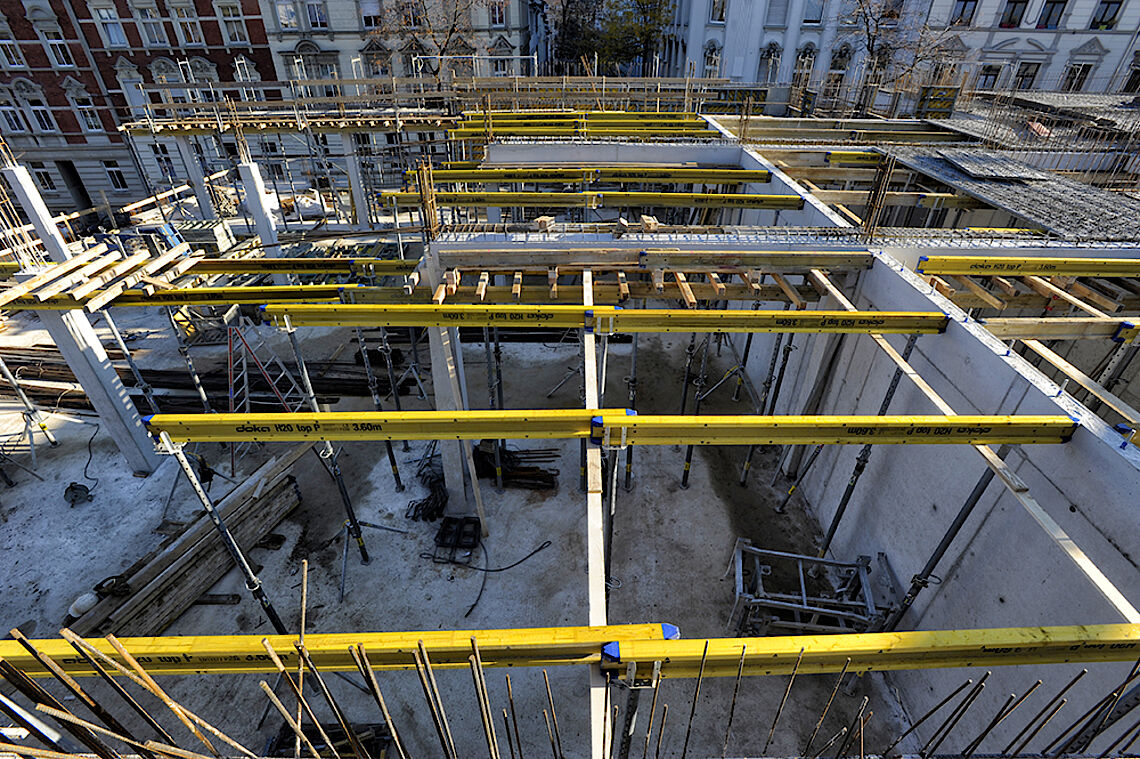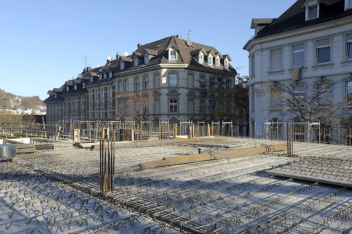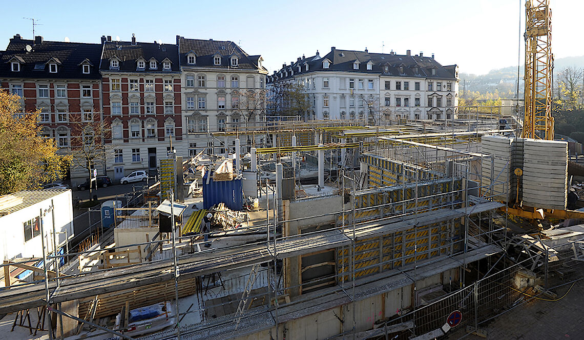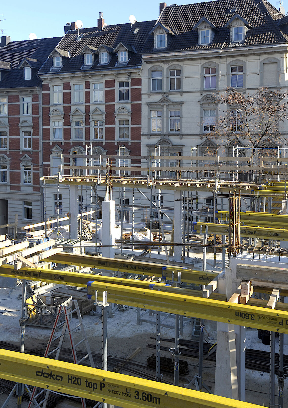 Die Tiefbauarbeiten sind seit einigen Tagen abgeschlossen, alle Verbindungsstücke neu verfüllt und verfestigt und so konnte der Gerüstbauer seine Arbeit zur Absicherung des Hochbaus der nun folgenden 1. Etage sowie des Staffelgeschosses gut durchführen.