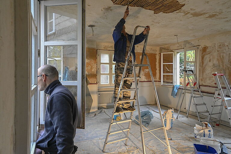Fröhliche Worte fliegen hin und her, während die provieler Tapeten abkratzen oder Fensterrahmen abschleifen. In einem proviel mobil-Einsatz helfen zwölf Mitarbeiterinnen und Mitarbeiter sowie wechselnde Fachkräfte eine Woche lang dem Verein Pechpfoten dabei, die neuen Räume des Tierschutzzentrum am Ortsrand von Elberfeld zu renovieren. Viel zu tun ist in dem alten, verwinkelten Haus mit den weiten Wiesen drumherum. Deshalb sind die Vereinsmitglieder dankbar für die Hilfe.