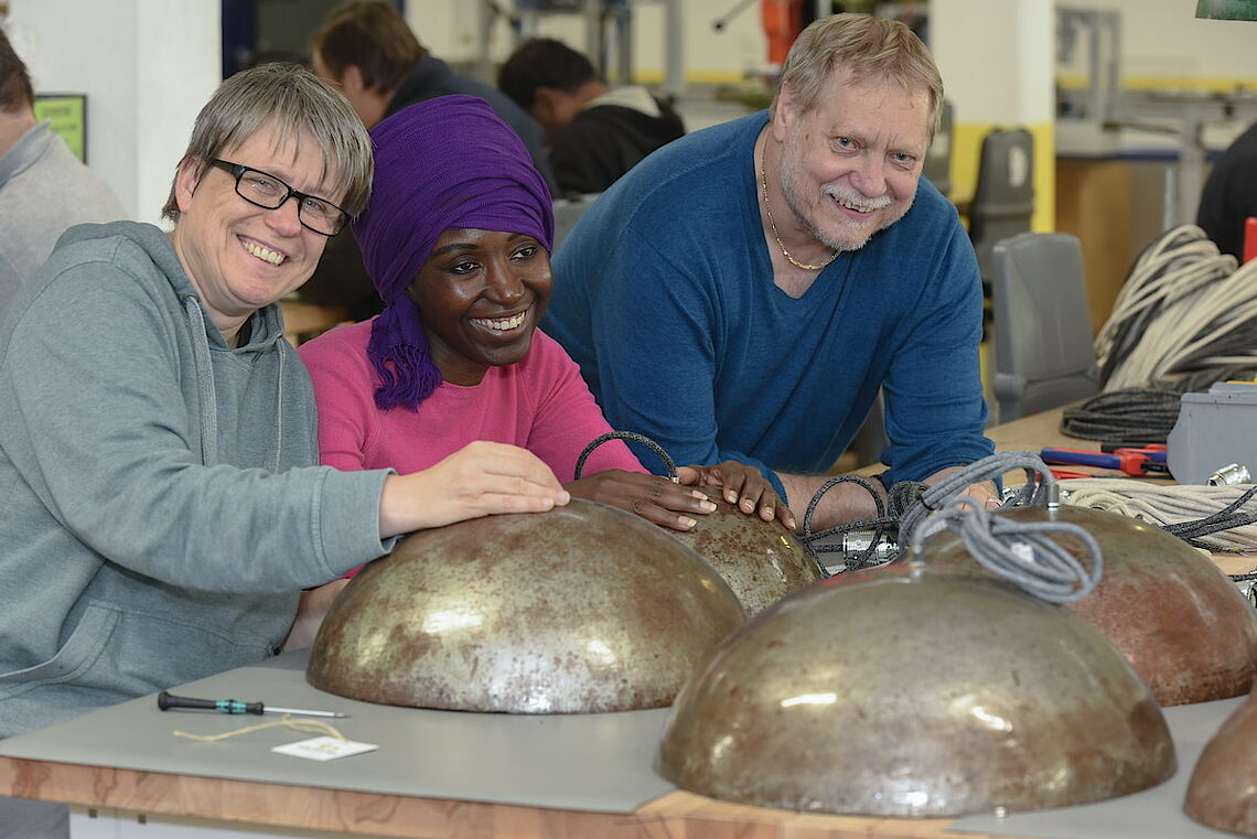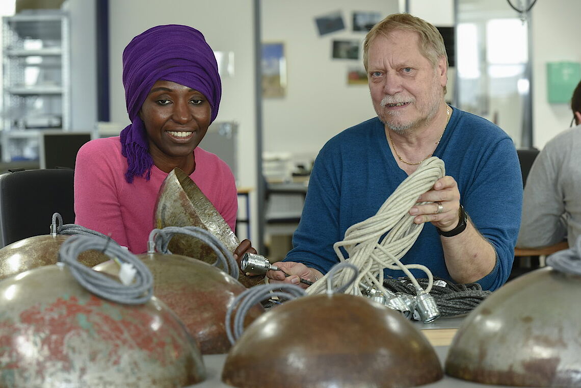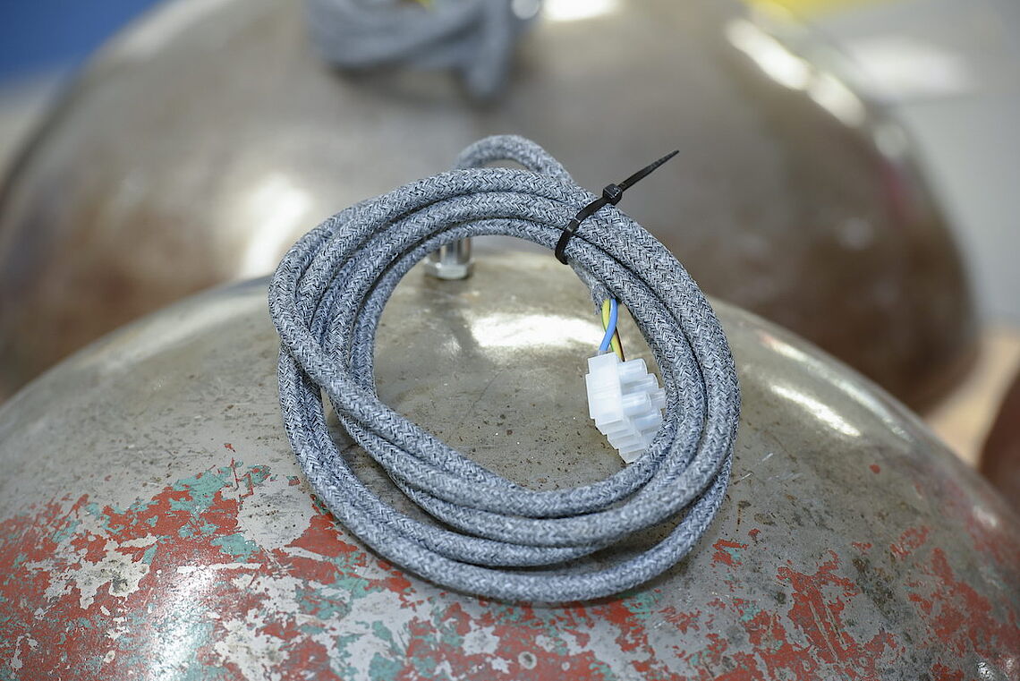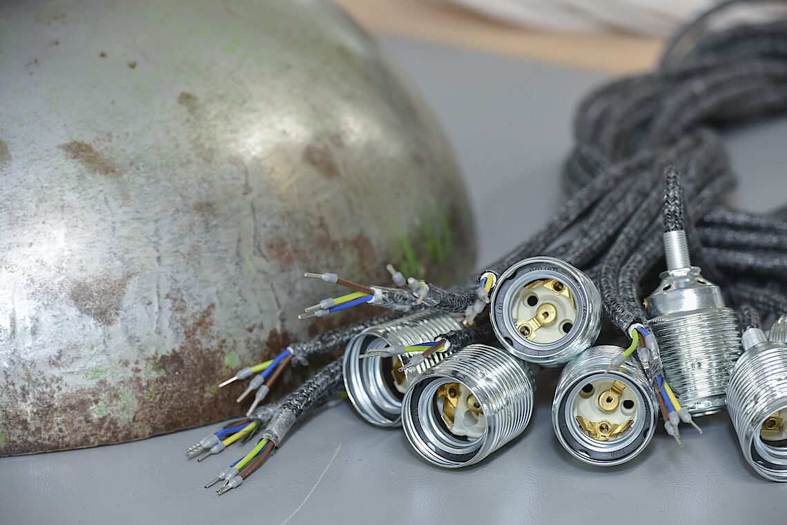 Die Plätze am Arbeitstisch mit den Ölfass-Leuchten sind bei proviel begehrt: „Diese Arbeit machen unsere Leute gerne“, sagt Holger Pfannkuch, Abteilungsleiter der Elektromontage bei proviel. Sorgsam befestigen die Mitarbeiter die Kabel an den E27-Fassungen und beides zusammen am Lampenschirm. Dabei müssen sie sehr exakt arbeiten, damit alle Kabel sicher verbunden werden und kein Strom an falscher Stelle fließt. „Für unsere Mitarbeiter ist das ein attraktives Produkt, weil man am Schluss die fertige Leuchte sieht und weiß, dass sie auch im Laden hängt“, erklärt proviel-Geschäftsführer Christoph Nieder.