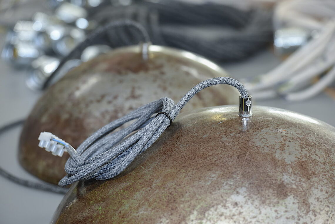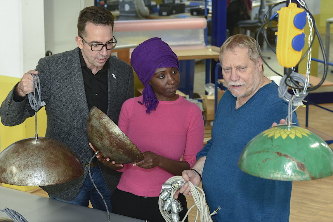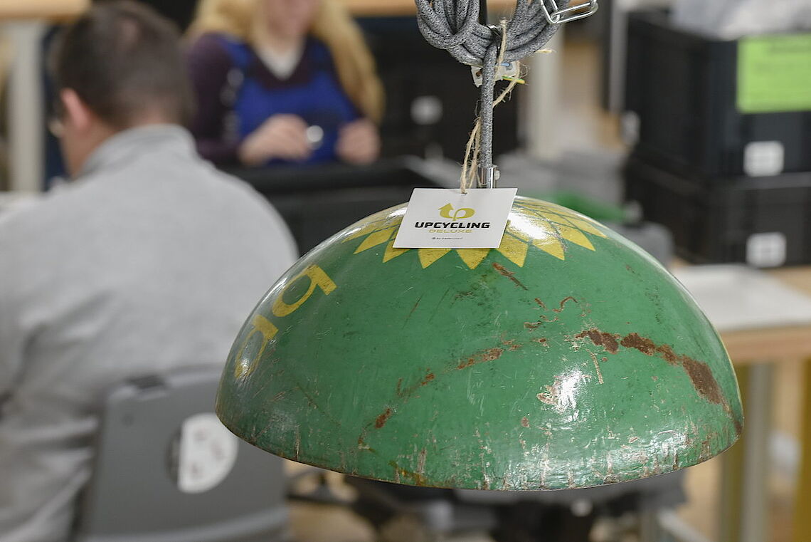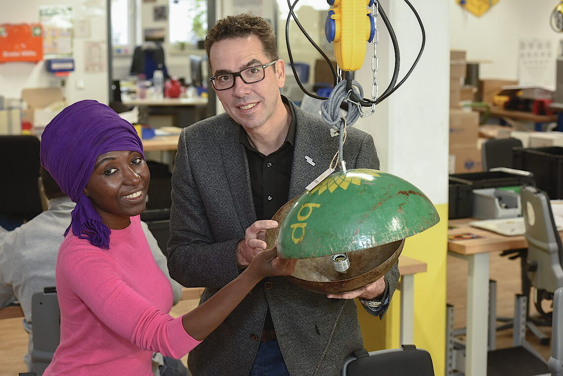 Die Plätze am Arbeitstisch mit den Ölfass-Leuchten sind bei proviel begehrt: „Diese Arbeit machen unsere Leute gerne“, sagt Holger Pfannkuch, Abteilungsleiter der Elektromontage bei proviel. Sorgsam befestigen die Mitarbeiter die Kabel an den E27-Fassungen und beides zusammen am Lampenschirm. Dabei müssen sie sehr exakt arbeiten, damit alle Kabel sicher verbunden werden und kein Strom an falscher Stelle fließt. „Für unsere Mitarbeiter ist das ein attraktives Produkt, weil man am Schluss die fertige Leuchte sieht und weiß, dass sie auch im Laden hängt“, erklärt proviel-Geschäftsführer Christoph Nieder.