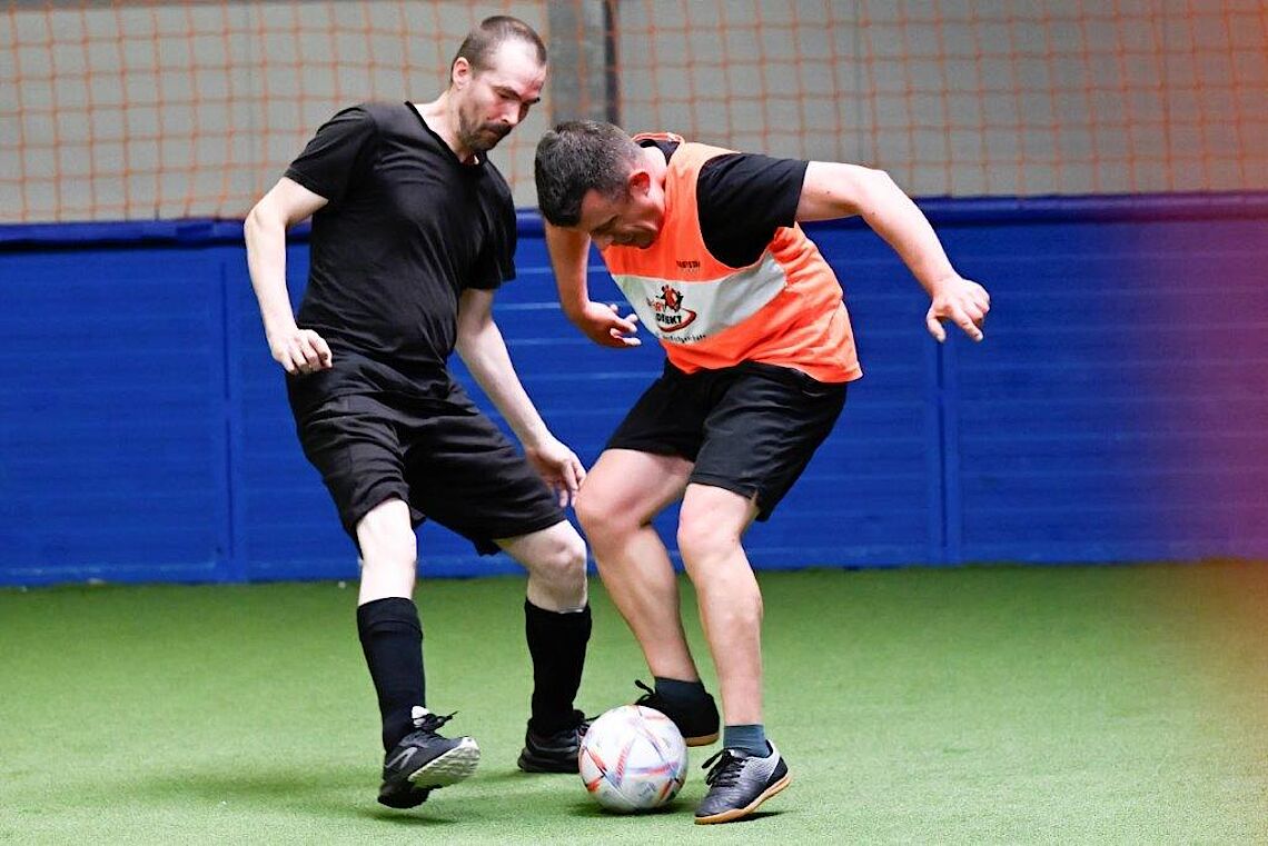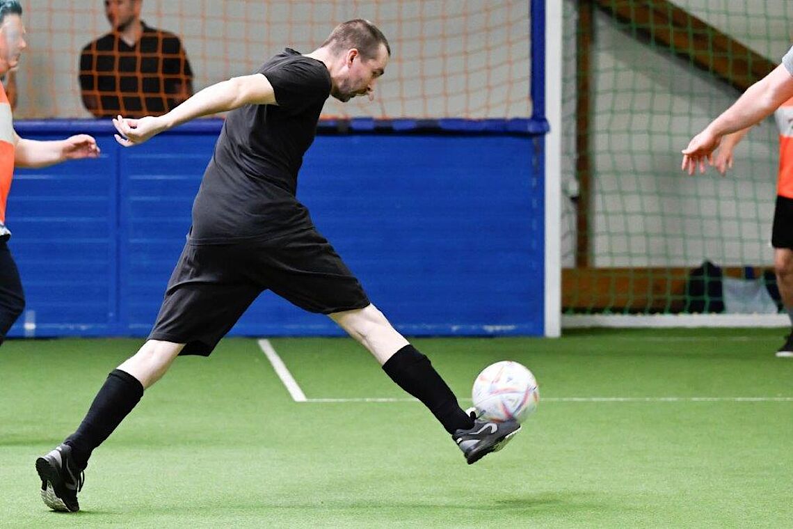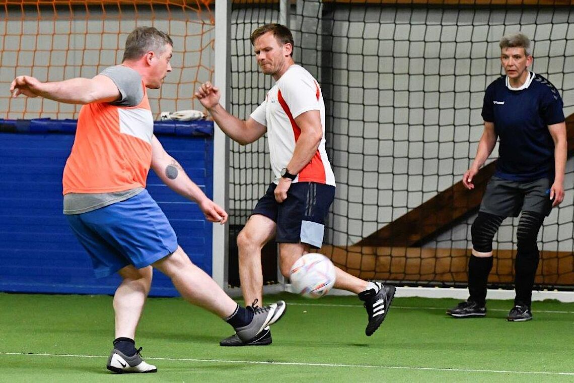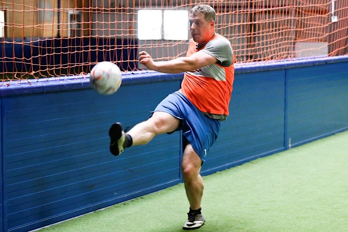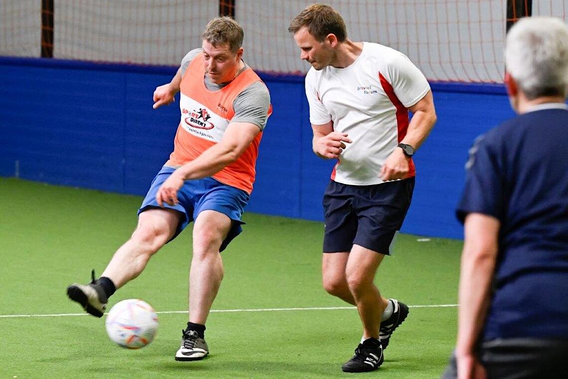 Fußball-Kurs stärkt die GemeinschaftMan sieht dem Spiel an, dass einige schon sehr lange zusammen trainieren. Versiert passen sie sich die Bälle zu. Doch auch Neulinge werden schnell integriert. Der Tonfall ist immer freundlich und wertschätzend. Es wird viel gelobt, bei Zusammenstößen besorgt nachgefragt und nie kritisiert.
