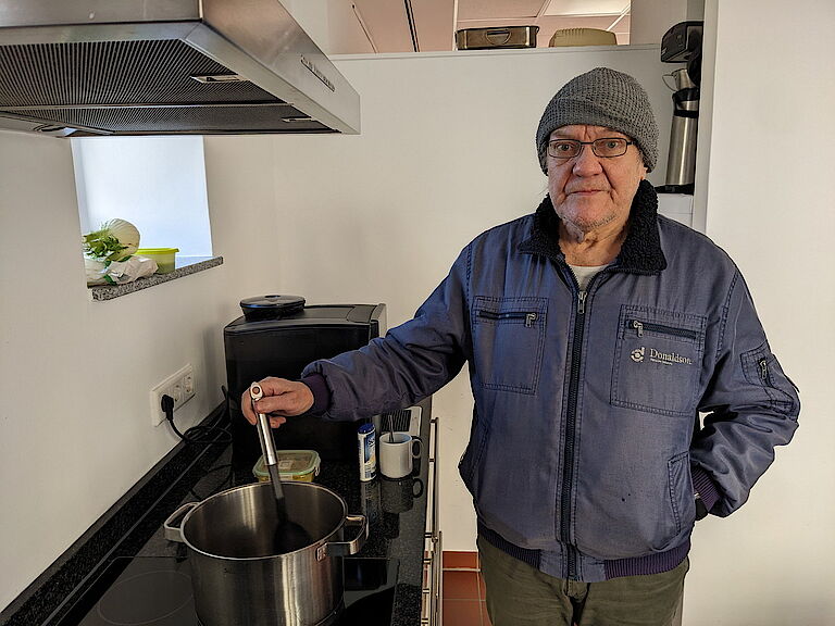 Ausflüge und gemeinsames KochenDonnerstags ist Markus Karl Biedermann fast immer dabei, wenn im gemütlichen Gruppenraum des BeWo-Treffs an der Hünefeldstraße gemeinsam gekocht wird. „Schnibbeln und später sauber machen kann ich ja – aber zu Hause mache ich das nicht“, erzählt er und gesteht, dass er häufig eher schnell als gesund isst. So sind die Donnerstage nicht nur ein schöner Austausch für ihn, sondern auch eine gute Gelegenheit für gesunde Ernährung. An den Ausflügen mit der BeWo in die LVR-Museen der Umgebung und den Ferienfreizeiten nimmt er ebenfalls gerne teil. So gibt es trotz Rente immer wieder schöne Abwechslung.
