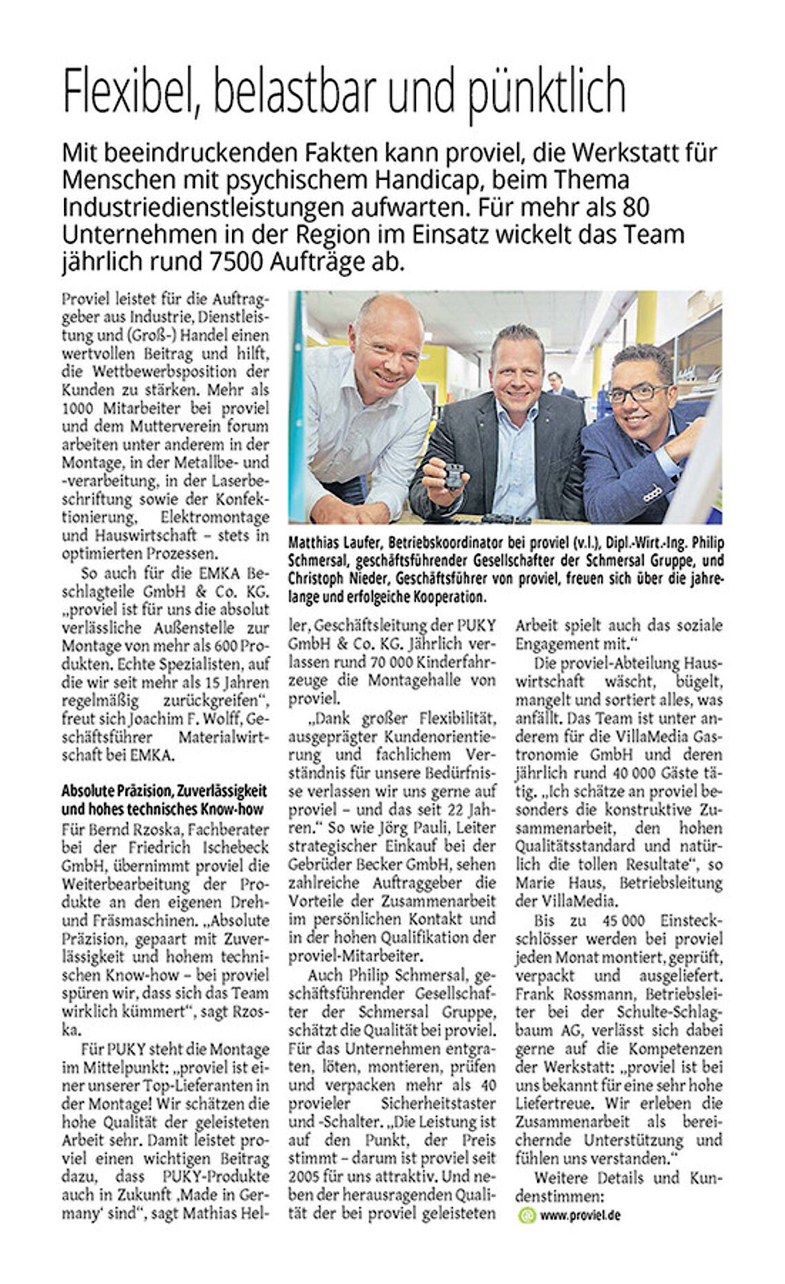 PROVIEL. Mit beeindruckenden Fakten kann proviel, die Werkstatt für Menschen mit psychischem Handicap, beim Thema Industriedienstleistungen für Unternehmen aufwarten. Für mehr als 80 Unternehmen in der Region im Einsatz wickelt das Team jährlich rund 7.500 Aufträge ab.