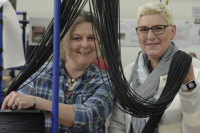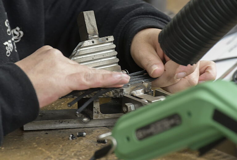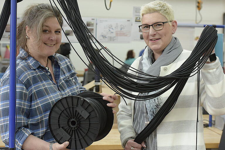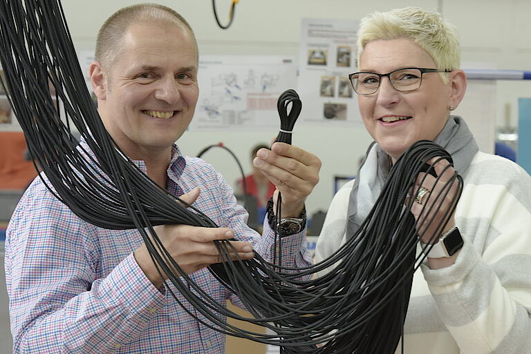 proviel-Abteilungsleiterin Sylvia Bube-Zöllkau und Betriebsleiter Oliver Kahl verantworten mit ihrem Team nicht nur das millimetergenaue Ablängen des reißfesten Seils. Danach folgt die Herausforderung, denn die Kordelenden werden per Heißschneider auf exakt 45 Grad schräg geschnitten. Das klingt einfacher als es ist und erfordert von den provielern höchste Konzentration. Ein perfekter Auftrag also für die Mitarbeiterinnen und Mitarbeiter, um sich in den Bereichen Feinmotorik, Ausdauer und kritische Kontrolle täglich zu trainieren und zu verbessern; ganz im Sinne der beruflichen Rehabilitation der proviel-Werkstatt.