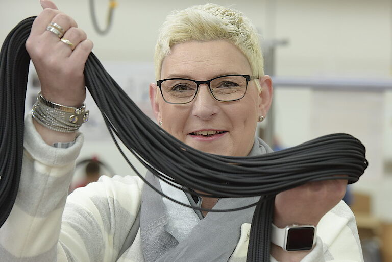 Neben den Standards versteht man sich bei Overmann auf Speziallösungen. „Es gibt Kunden, da tüfteln wir zwei Jahre an einer Realisierung“, betont Christine Hungenberg, zuständig für Marketing und Vertrieb. Ein solches Produkt wird bei proviel am Standort Farbmühle seit gut drei Jahren weiterverarbeitet. Für einen namhaften Hersteller von Gartengeräten liefert Overmann das Zugseil, welches zur weiteren Bearbeitung in die Werkstatt für Menschen mit psychischem Handicap kommt.