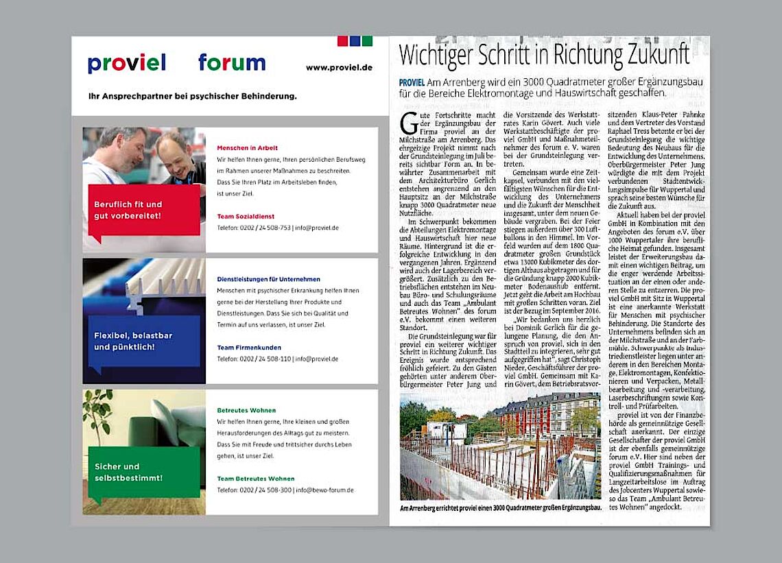 Für die Wuppertaler mit psychischer Erkrankung, die gerne in einer Werkstatt arbeiten und sich qualifizieren möchten, für Wuppertaler Langzeitarbeitslose, die sich gerne im Echtbetrieb trainieren möchten und auf dieser Basis für Unternehmen aus Stadt und Region, die wir mit unseren (Industrie)Dienstleistungen bei ihrer eigenen Unternehmensentwicklung unterstützen. Und last but not least für Wuppertaler mit psychischer Erkrankung, die wir mit unserem Team 'Ambulant Betreutes Wohnen' aktiv bei der Lebensgestaltung unterstützen.