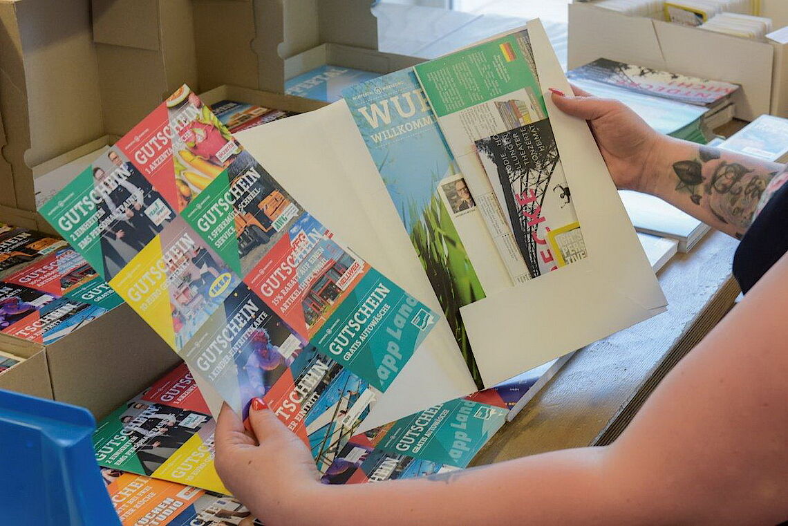Wer nach Wuppertal zieht, der erhält bereits beim Einwohnermeldeamt einen charmanten Vorgeschmack auf seine neue Heimat. Die Neubürgermappe wird seit rund zehn Jahren an Zugezogene ausgegeben – und ist ein durch und durch lokales Produkt. Die Wuppertal Marketing GmbH wählt die Inhalte der Mappe unter Berücksichtigung aktueller Termine und Veranstaltungen aus Freizeit, Kunst und Kultur aus, Wuppertaler Unternehmen stellen Gutscheine und Informationen zur Verfügung und die Stadtverwaltung liefert die informativen Inhalte.