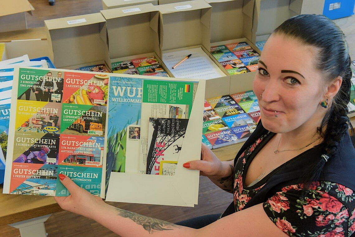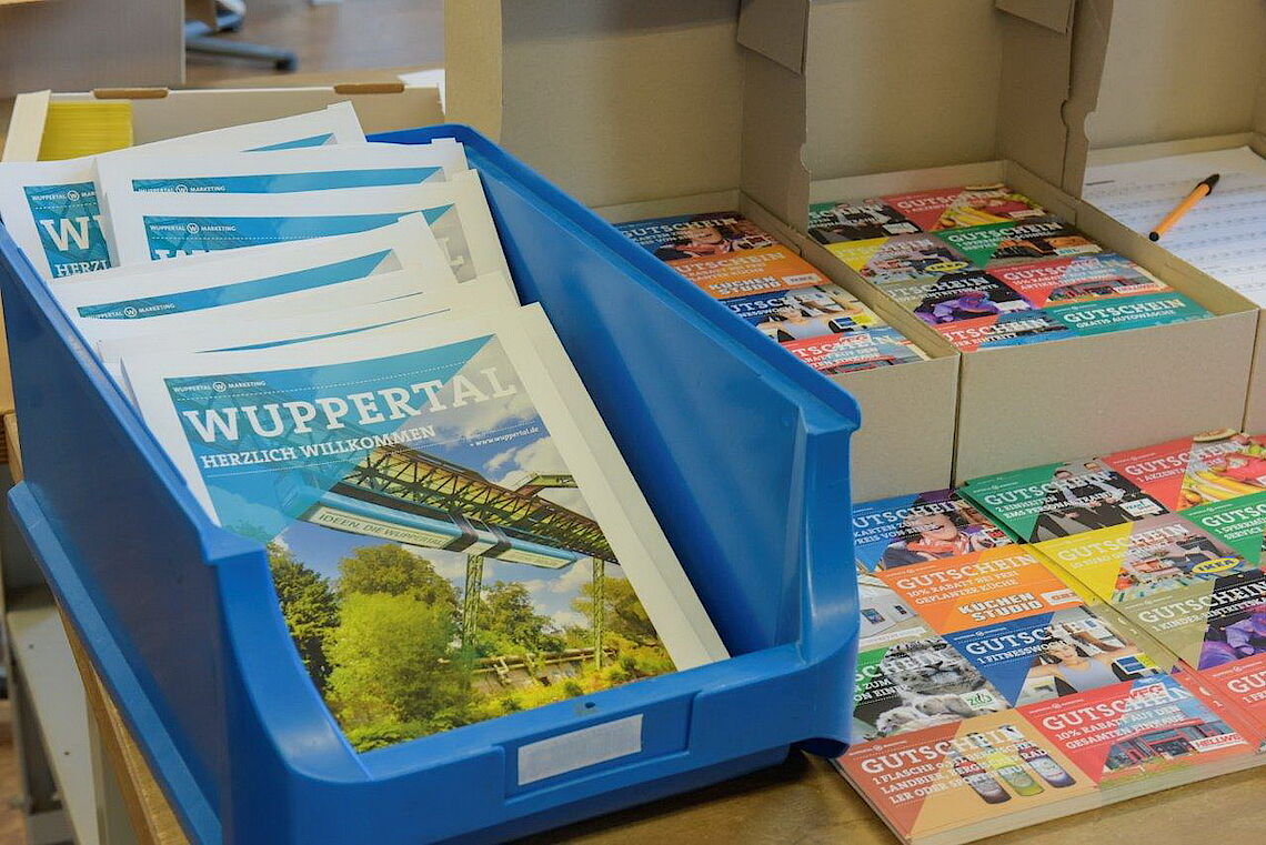 Sobald der Vorrat der Mappen im Einwohnermeldeamt und in den Bürgerbüros zur Neige geht, läuft die nächste Bestellung bei proviel auf. Mehrmals im Jahr packt das Werkstatt-Team in der Unterbarmer Farbmühle die Inhalte neu zusammen, bestückt die Mappen mit den aktuellen Inhalten und liefert zeitnah an die Verteilstellen aus. Damit erspart sich das Stadtmarketing eine aufwändige Lagerhaltung der einzusortierenden Inhalte und leeren Hüllen ebenso wie die Bevorratung mit konfektionierten Mappen. Dafür wird ein Teil der proviel-Flächen drei- bis viermal im Jahr zur „Außenstelle“ des Stadtmarketings. Mehrere Paletten mit Drucksachen verteilen sich nach einem exakten Plan, damit die Konfektionerung zügig und fehlerfrei ablaufen kann.