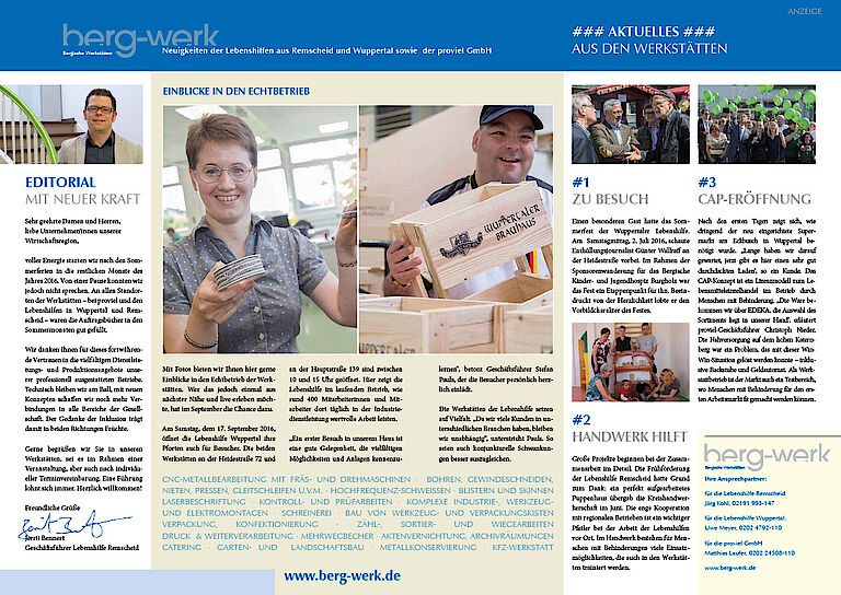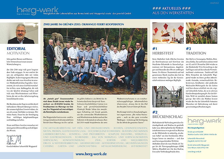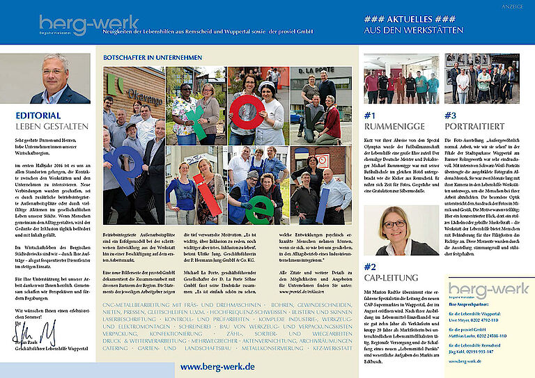 Gemeinsam mit den Kollegen im Kompetenzverbund Bergische Werkstätten ist es uns bei proviel immer wieder ein wichtiges Anliegen, unsere Möglichkeiten und Stärken als Unternehmensdienstleister und die vielfältigen Möglichkeiten zur Kooperation bei Praktika und BIAP (Betriebsintegrierte Arbeitsplätze) den Unternehmen aus Wuppertal bzw. insgesamt aus dem Bergischen Städtedreieck vorzustellen. Im Trio mit den Lebenshilfen in Wuppertal und Remscheid haben wir uns von daher dazu entschieden, über die Bergische Wirtschaft / Magazin der IHK Wuppertal-Solingen-Remscheid alle 2 Monate per Doppelseite die Leserinnen und Leser neu zu informieren.