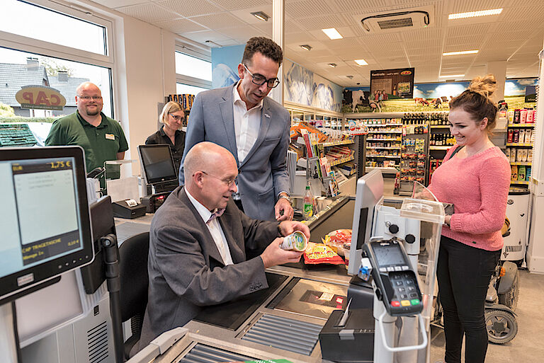 Ein Monat nach der Eröffnung am 18. August 2016 besuchte Dr. Stefan Kühn unseren CAP-Markt am Eckbusch, um seiner Freude über den gelungenen Auftakt Ausdruck zu verleihen. Gemeinsam mit Frau Köster und Herrn Kraft vom Bürgerverein fiel das Resümee zu den ersten Verkaufstagen bzw. zu den 16.000 ersten Kassenvorgängen sehr positiv aus.