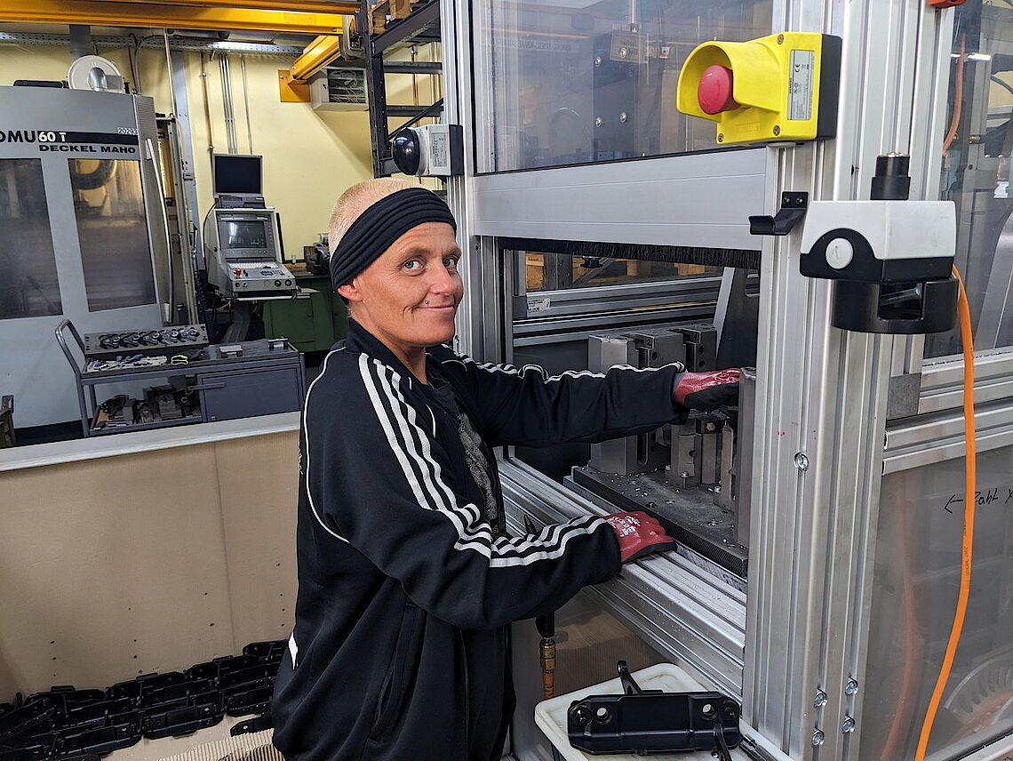 Diana Schäfer strahlt: „Die Zeit bei der Arbeit verfliegt. Ich bin wirklich gerne hier!“ Seit 1. Juli hat sie einen festen Arbeitsvertrag bei dem Unternehmen Automobilscharniere Hasten (AHA) in Remscheid. Damit hat die 44-Jährige auch einen Berufswechsel vollzogen, der ihr gefällt. Ursprünglich hatte sie Arzthelferin gelernt, war lange im Seniorenheim tätig. Doch jetzt faszinieren sie die großen Maschinen in der langgestreckten Werkshalle: „Ich darf hier an allen Maschinen arbeiten. Bei einer bin ich sogar die einzige, die sie bedienen kann“, erzählt sie stolz.