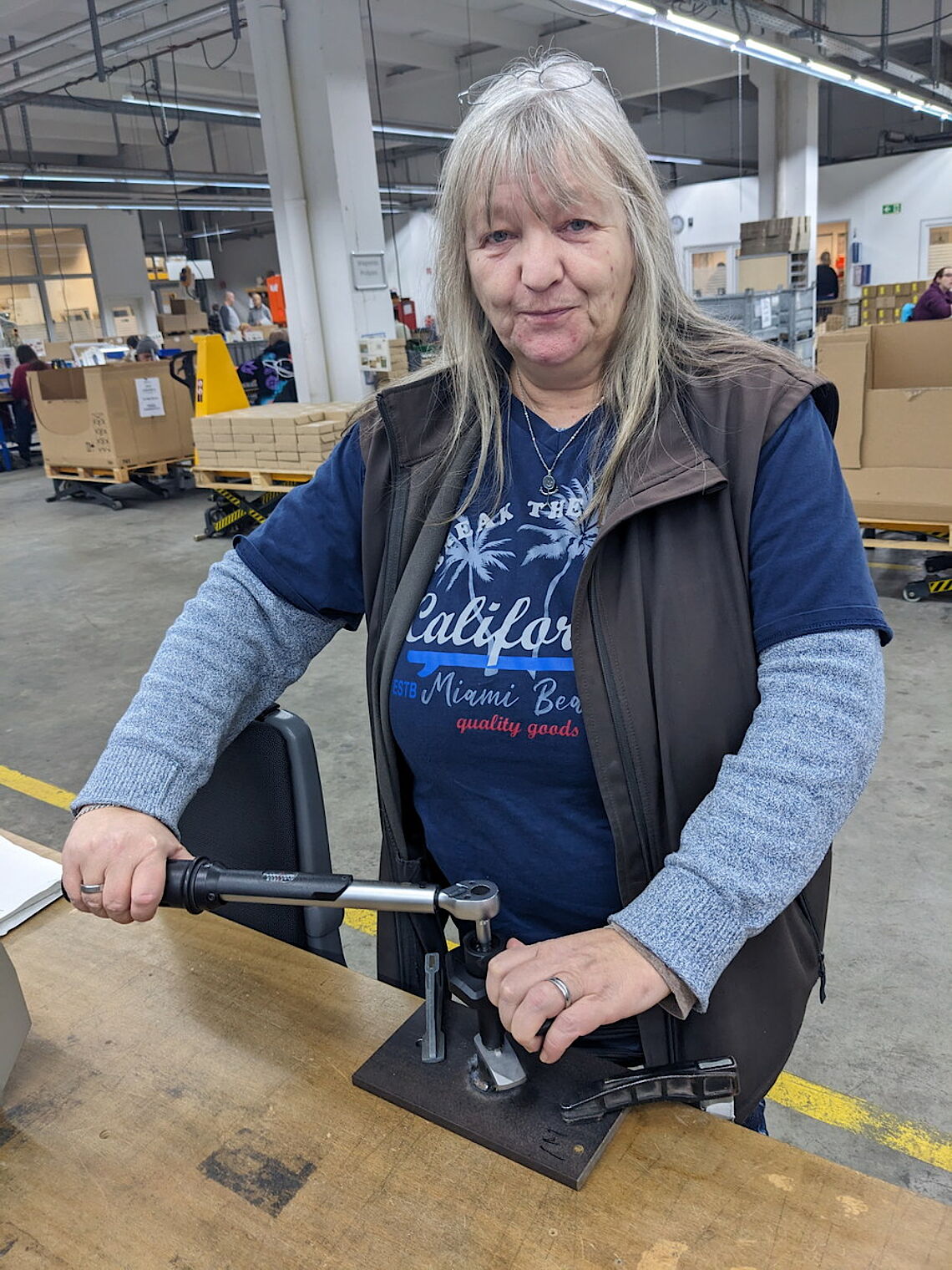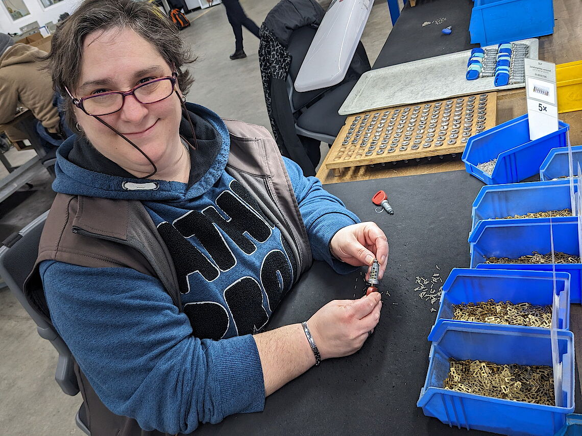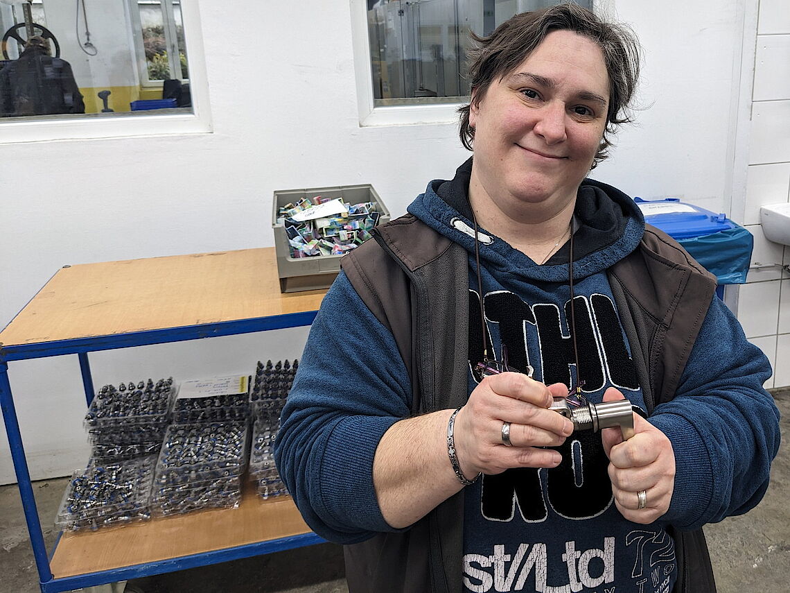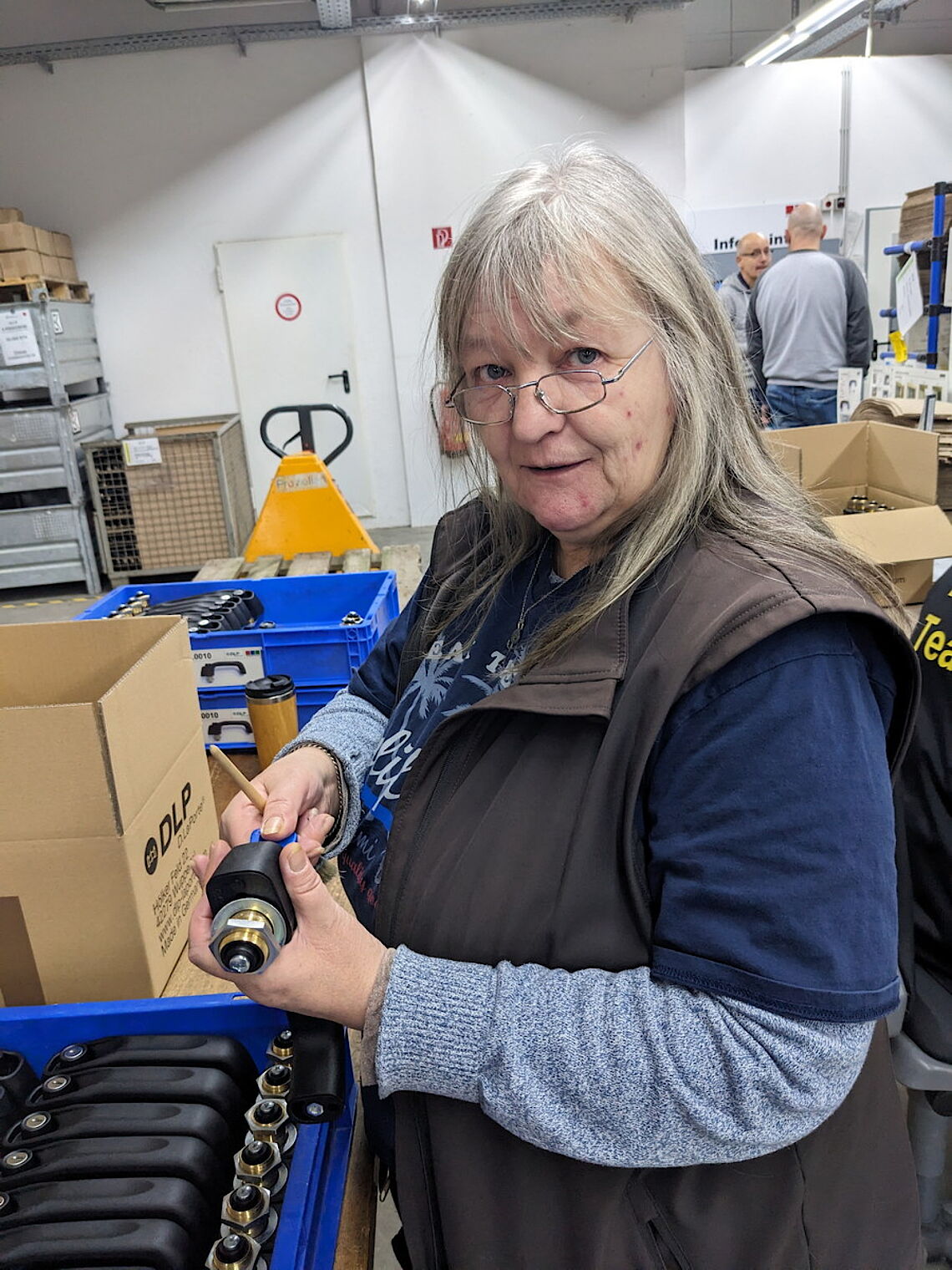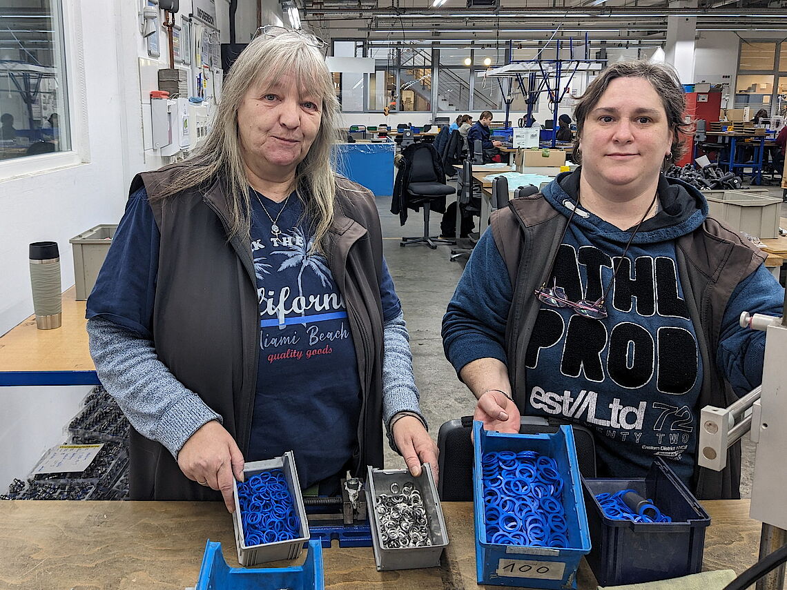 Bianca Augustin und Monika Bernhardt bilden als Mitarbeiterinnen der vierköpfigen Qualitätssicherung (QS) an vielen Stellen das Bindeglied zu den Fachkräften. Beide sind schon seit über zehn Jahren als Werkstattmitarbeiterinnen (proviel) in der Stammbelegschaft der Abteilung provieliert und kennen alle Details. Sie kontrollieren, ob der Kunde alle Einzelteile in richtiger Stückzahl geliefert hat, und stellen gemeinsam mit ihren Kollegen die verschiedenen Schräubchen, Scheiben, Dichtungsringe und anderes Zubehör in Kästen an den einzelnen Arbeitsplätzen bereit. Dazu hängen sie jeweils eine Arbeitsanleitung mit Bildern, so dass während der Arbeit mit einem Blick erkennbar ist, wie alles zusammengebaut werden soll. „Mit einer guten Endkontrolle stellen wir sicher, dass sich die Kunden auf die Qualität unserer Arbeit verlassen können“, sagt Monika Bernhardt. Sie schätzt die Abwechslung an ihrem Arbeitsplatz und die Kommunikation mit den Kolleginnen und Kollegen sowie die enge Zusammenarbeit mit den Fachkräften.