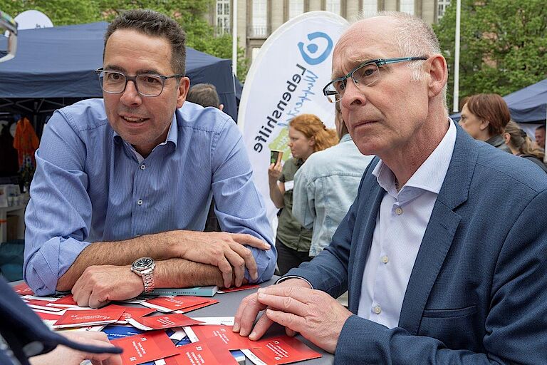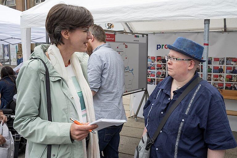 Den Besuchern am proviel-Stand wurde das Problem anhand der Flyer schnell klar. „Wir müssen Barrieren breiter denken“, erkannte Sozialdezernent Stefan Kühn und gab zu bedenken: „Vielen Menschen macht eine psychische Behinderung auch Angst – sie wissen nicht, wie sie damit umgehen sollen.“ Oberbürgermeister Uwe Schneidewind nahm die bunten Handzettel gerne mit und hatte gleich Ideen, wie das Thema einem breiten Kreis an Menschen nahegebracht werden könnte. Dass sich bei der Wuppertaler Stadtverwaltung in den vergangenen Jahren schon viel zu einer besseren Inklusion verändert hat, lobte proviel-Geschäftsführer Christoph Nieder: „Da hat sich eine gute Kultur entwickelt.“ Heute seien bereits 600 Menschen mit Behinderungen unterschiedlichster Art in der Stadtverwaltung tätig, berichtete der Oberbürgermeister.