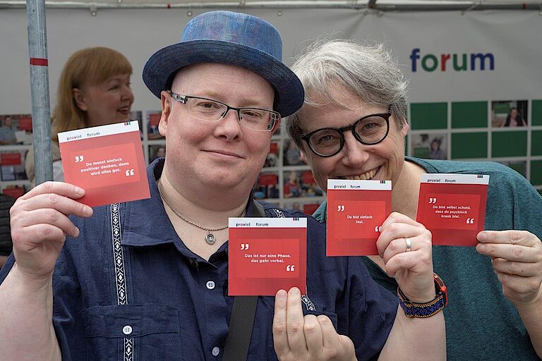 „Psychische Erfahrungen sind ja nicht sichtbar“, verdeutlichte proviel-Mitarbeiterin Anja Meyer, eine der Initiator*innen der Aktion. Das Vorbereitungsteam für den Barrierefrei-Tag fragte die Kolleginnen und Kollegen bei proviel, welche dummen Sprüche den Menschen schon begegnet sind, und was sie sich stattdessen wünschen. Der Rücklauf war groß. „Wir haben dann die plakativsten Sprüche ausgewählt“, erklärte Anja Meyer. Jetzt heißt es auf den Briefchen provokativ: „Das ist nur eine Phase, das geht vorbei.“ „Geh doch einfach mal eine Runde um den Block.“ oder „Du musst einfach positiver denken, dann wird alles gut.“