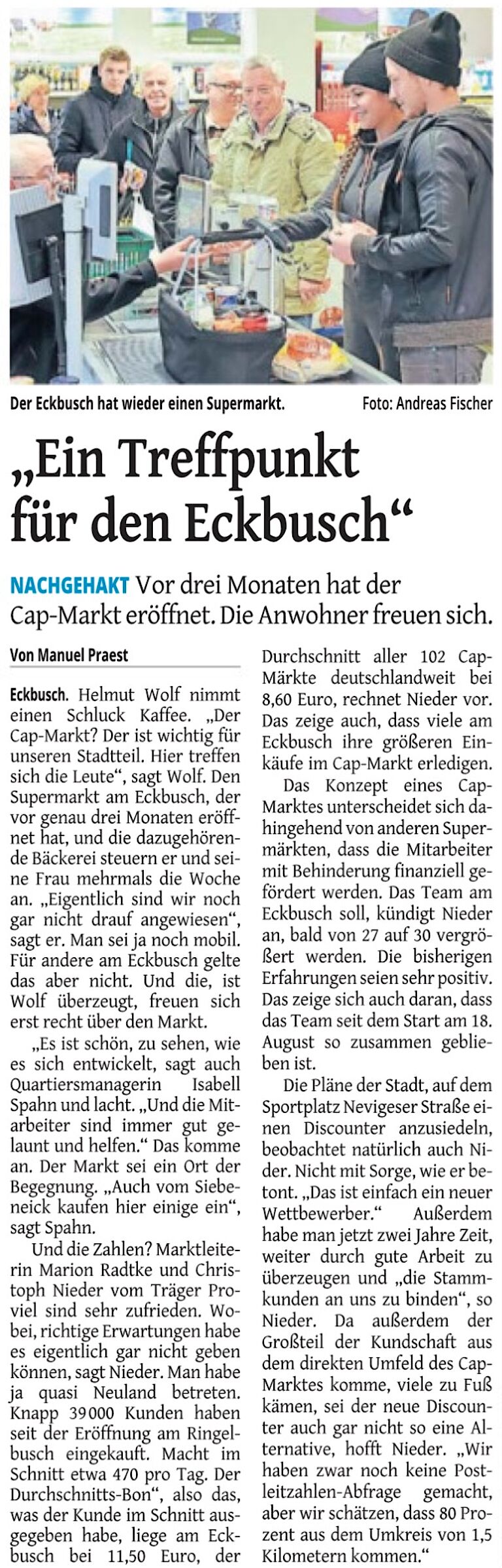 Mit attraktiven Wochenangeboten und saisonalen Spezialitäten ist der CAP Markt genau das, was sich viele Bewohner/-innen am Eckbusch gewünscht haben. Kunden loben – sogar in kleinen Briefen – das Konzept: „Liebes CAP-Team, wir wollen uns bedanken für einen tollen Supermarkt mit einem guten Sortiment, günstigen Angeboten, familiärer Atmosphäre und insbesondere jederzeit hilfsbereiten und sehr freundlichen Mitarbeitern! Wir kommen gerne und regelmäßig bei Ihnen einkaufen.“