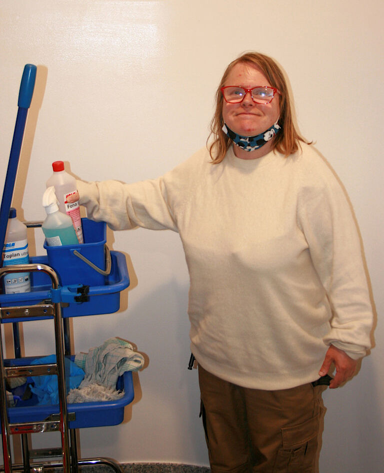 Als sie nach fünf Wochen dann an ihren Arbeitsplatz in der Hauswirtschaft zurückkehren konnte, war sie überglücklich. „Mir sind die Freudentränen herabgelaufen“, erinnert sich Bianca Panter. „Ich habe mich riesig gefreut. Ich habe alle vermisst und hatte Angst um die Leute.“ Jetzt kann sie wieder jeden Morgen an ihren gewohnten Platz kommen und ihre üblichen Aufgaben erledigen. Gerne übernimmt sie Reinigungsaufgaben oder bringt die Körbe mit Wäsche in andere Abteilungen. „Mir macht es Freude, wenn ich den Leuten helfen kann“, betont sie.