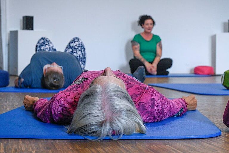 „Schenke deinem Herzen ein kleines inneres Lächeln!“ Entspannt sitzen die Teilnehmenden der Yoga-Stunde auf dicken Meditationskissen auf Matten. Sie haben die Augen geschlossen, die Hände liegen auf den Oberschenkeln, wobei Daumen und Zeigefinger sich berühren. Eine tiefe Ruhe breitet sich im Raum aus. Alle beobachten, wie ihr Atem die Bauchdecke hebt und senkt. Michaela Kahl leitet mit ruhiger Stimme die Übungen an.