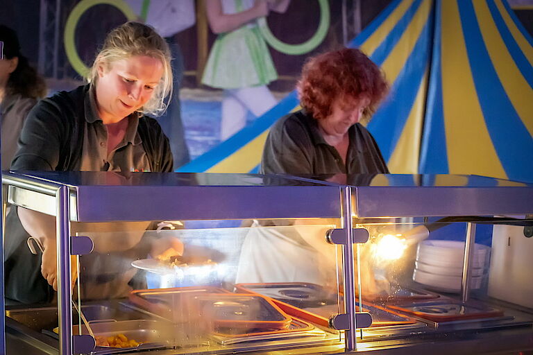 Für das Team vom Schulbistro ist der Einsatz beim Kinderferienzirkus immer ein Highlight, denn neben dem Besteck in Servietten einrollen oder dem Vorbereiten der Wärmebehälter bleibt genug Zeit das Training der Kinder und der Zirkus-Crew zu bestaunen. Im Laufe des Vormittags wird dann von den Kolleg:innen aus der Farbmühle das dort zubereitete Essen geliefert. Besonders die "klassischen" Kindergerichte wie Spaghetti Bolognese werden mit großer Freude von den Kindern gegessen.