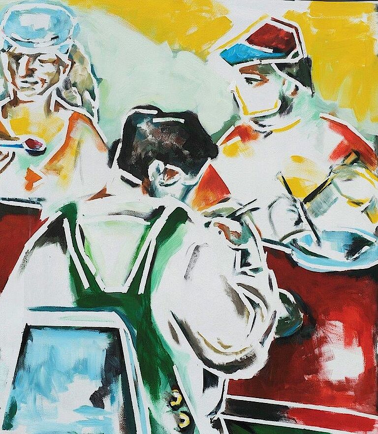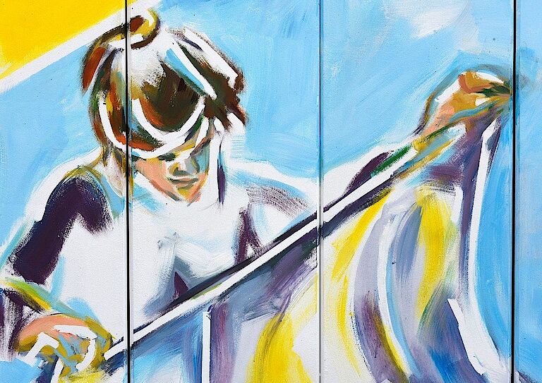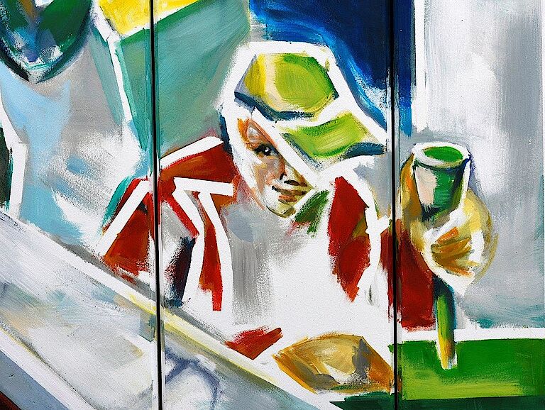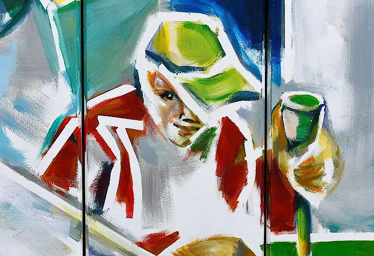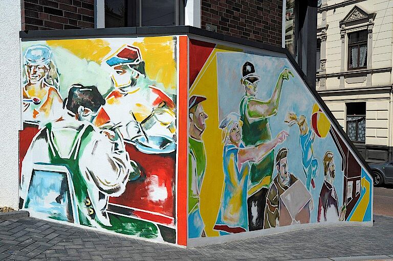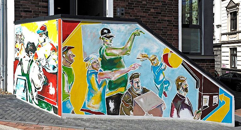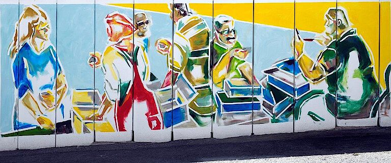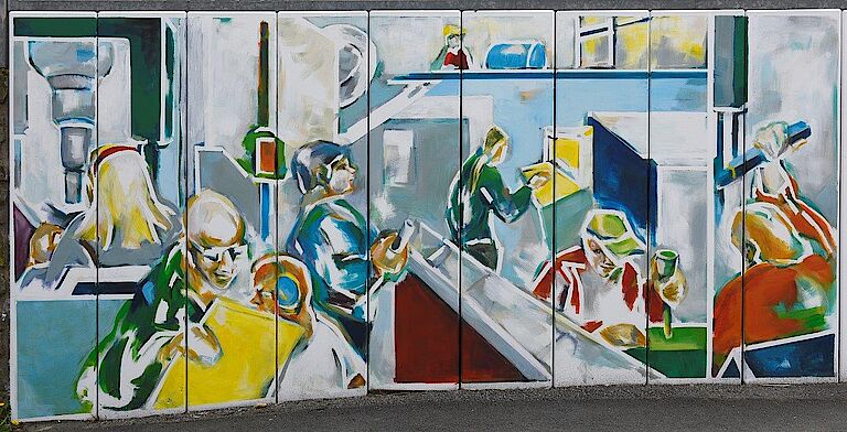 Neue Abbildungen aus dem Arbeitsalltag unseres Hauses zieren Dank der Arrenberger Künstlerin Annette Marks unsere Zufahrt zum Standort Milchstraße. Präzisionsarbeit in der Metallabteilung, Montageflexibilität im Industrieservice, gute Verpflegung dank unserer hauseigenen Küche, immer saubere Wäsche aus unserer Hauswirtschaft, gute Laune am Mittagstisch und den richtigen Weg zu unserer Pforte – das sind Aussagen der neuen Bilderwelt. Aber vor allem zeigen die Arbeiten Gesichter und Stimmungen aus unserer Beruflichen Bildung und unserer Produktion und geben Einblicke in die Stimmung unserer Mitarbeiterinnen und Mitarbeiter.