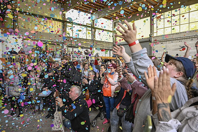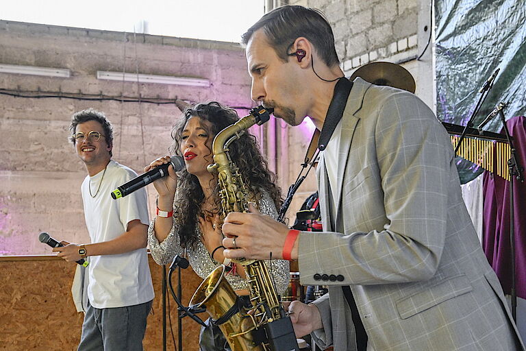 Als dann um 13.30 Uhr die Band den Saal rockte, war kein Halten mehr. Überall tanzten Menschen alleine, zu zweit oder in Grüppchen. Draußen wippten sie mit den Füßen im Takt der Musik. Und sogar noch an der Nordbahntrasse horchten die Leute auf.