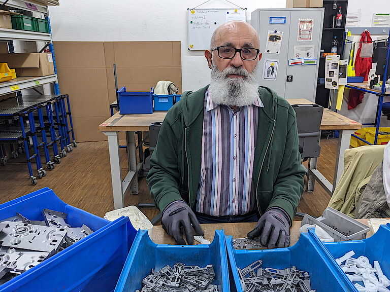 Haydar Pektas kennt alle Arbeitsplätze in der Montage. Seit 15 Jahren arbeitet der 62-Jährige bei proviel und kommt jeden Morgen gerne an seinen Arbeitsplatz. „Ich möchte nicht faul werden, sondern immer beschäftigt bleiben“, betont er. Mit Sorge blickt er schon auf das nahende Rentenalter. Lieber würde er weiter bei proviel arbeiten. Möglichkeiten auf dem Ersten Arbeitsmarkt sieht er für sich nicht, das habe er schon ausprobiert: „Als Mensch mit Behinderung hat man da keine Chance.“ Denn aufgrund von Gleichgewichtsproblemen kann Haydar Pektas nicht schnell hin- und herlaufen und nur im Sitzen arbeiten.