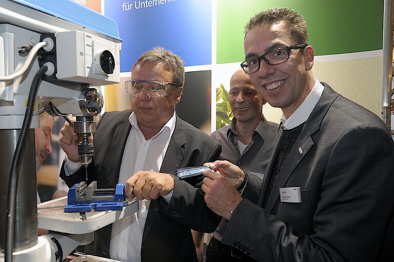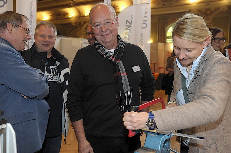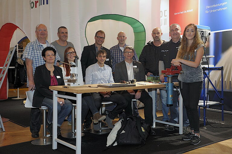 Als metallaffines Unternehmen haben wir das interessierte Publikum sägen, pfeilen, körnen, bohren lassen und so entstanden viele schöne neue Schlüsselanhänger für den eigenen Schlüsselbund. Eine gelungene Aktion, um über Interessen und Fähigkeiten gut ins Gespräch zu kommen.